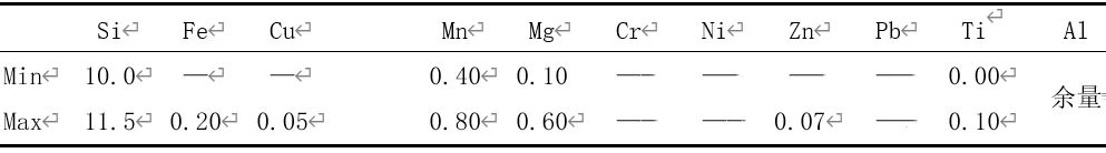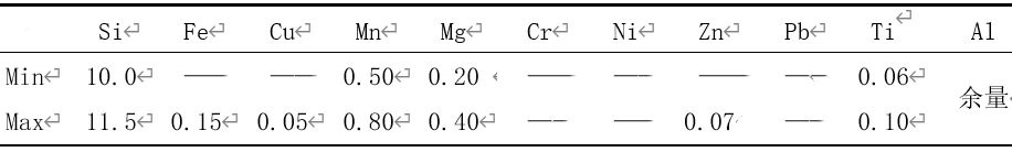 表1 AlSi10MnMg的化學(xué)成分 wb/% 由表1可知,標(biāo)準(zhǔn)中規(guī)定的AlSi10MnMg鋁合金中,Mg含量為0.1%~0.6%,范圍比較寬。吳樹森等研究發(fā)現(xiàn),Mg含量的增加與抗拉強(qiáng)度與屈服極限正相關(guān),與伸長(zhǎng)率負(fù)相關(guān)。過(guò)低的Mg不能產(chǎn)生足夠的強(qiáng)度,也不利于后續(xù)的熱處理,而過(guò)高的Mg能導(dǎo)致伸長(zhǎng)率降低,Mg與Si形成Mg2Si強(qiáng)化相,使得α-Al固溶體結(jié)晶點(diǎn)陣發(fā)生畸變,從而起到強(qiáng)化合金的作用。Mg的含量為 0.20%~0.40%可以取得較好的綜合力學(xué)性能。 Fe是壓鑄鋁合金中一種有害元素,其以FeAl3和Al-Si-Fe的片狀或者針狀組織存在,降低合金的力學(xué)性能,F(xiàn)e含量要低于0.15%,Mn元素可以與Fe形成化合物,進(jìn)一步消除鐵有害因素,同時(shí)Mn可以提高產(chǎn)品球狀結(jié)晶組織含量,將Mn含量保持為0.50%~0.80%。 適當(dāng)增加Ti能顯著細(xì)化鋁合金的晶粒組織,提高合金的力學(xué)性能,降低合金熱裂紋傾向,故將Ti含量控制為0.06%~0.10%之間。由此,調(diào)整后壓鑄鋁合金的成分見表2。