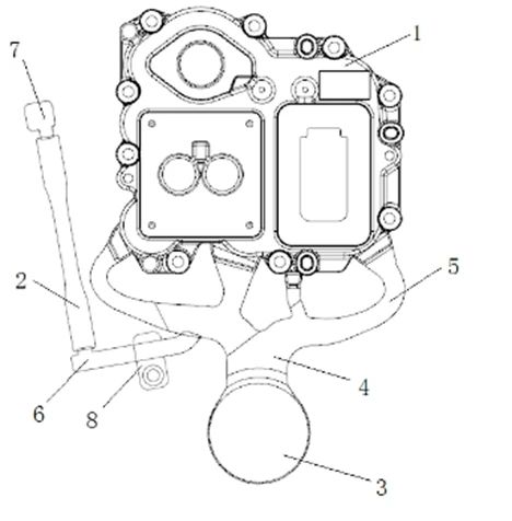 表2 試驗(yàn)材料成分AlSi10MnMg wb/% 3、模具設(shè)計(jì)與數(shù)值模擬 圖2為該電池罩蓋澆注系統(tǒng)基本結(jié)構(gòu),總投影面積為290 c㎡, 澆注總質(zhì)量為0.78 kg,選用UB350ic壓鑄機(jī),該設(shè)備鎖模力為3 500 kN。設(shè)計(jì)模具每模1件,壓室直徑為ø60mm,料缸充滿度35%。模具有五個(gè)分支澆道,其中左側(cè)分支澆道制造伴隨鑄件的試片2,并通過(guò)阻斷器8控制是否需要制造試片。根據(jù)該產(chǎn)品要求,鑄件內(nèi)左下側(cè)“眼鏡孔”區(qū)域、 右下側(cè)“矩形方框” 區(qū)域、澆注末端“圓孔”區(qū)域安裝傳感器等零部件,這3個(gè)部位是通孔,并且該區(qū)域加工后所有加工表面氣孔應(yīng)小于0.6 mm。鑄件4個(gè)分支澆道呈梳狀結(jié)構(gòu),內(nèi)澆口長(zhǎng)度為75 mm,澆口厚度為2.0mm,為凝固模數(shù)的2/3,總澆口截面積為150 m㎡,計(jì)算可得平均流速為40 m/s左右。壓鑄模采用FS438壓鑄熱作模具鋼,其具有良好的淬透性、韌性、熱強(qiáng)性、熱疲勞性能,熱處理變形小等。冷卻介質(zhì)為水,局部采用10 kg/c㎡的可編程間斷高壓點(diǎn)冷卻,自然排氣,通過(guò)模擬分析確定渣包位置以及排氣波板的設(shè)計(jì)。