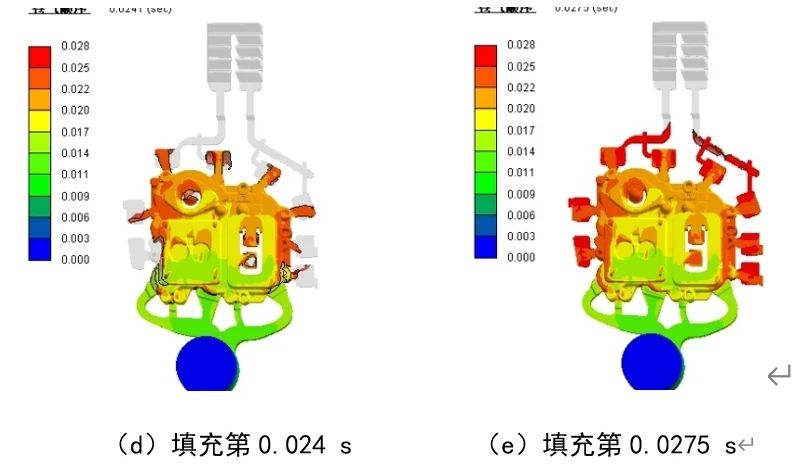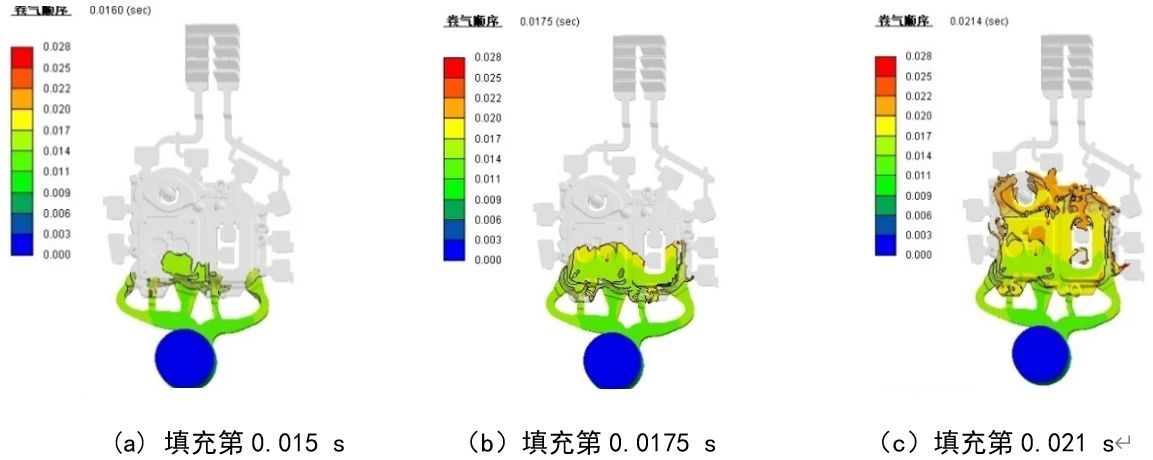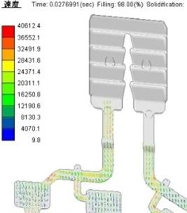 圖3 電池罩蓋填充卷氣模擬 圖4為填充0.277 s時(shí)的速度云圖。“π”型排氣波板是將一個(gè)傳統(tǒng)的排氣波板中間隔離,同時(shí)保留末端連通,一般左右兩邊隔離長(zhǎng)度為4~5個(gè)牙扣,該結(jié)構(gòu)既可以保證左右兩側(cè)氣體排出互不干擾,同時(shí)縮小空間,節(jié)省加工制造成本。從圖4可以看出,該時(shí)刻左側(cè)鋁液達(dá)到第一牙扣,右側(cè)即將抵達(dá)第一牙扣,使用粒子跟蹤技術(shù)測(cè)量左側(cè)前端速度為12 m/s,右側(cè)為1 3m/s,由于波板平均間隙為0.7 mm,兩股鋁液經(jīng)過(guò)第一牙扣后速度迅速下降,到第二牙扣幾乎停止運(yùn)動(dòng),鋁液最終停止的位置與鋁液粘度、模具溫度以及鑄造壓力等有關(guān),設(shè)計(jì)左右兩側(cè)分別獨(dú)立4個(gè)牙扣,在第5~8個(gè)牙扣連通,實(shí)踐證明“π”型排氣波板設(shè)計(jì)合理,生產(chǎn)過(guò)程使用可靠。