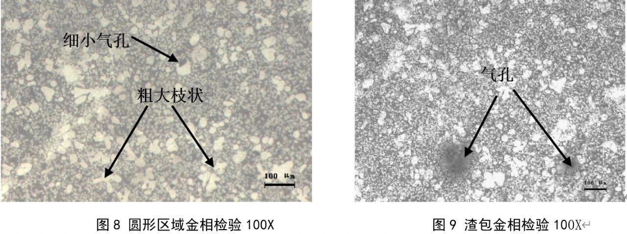 在產(chǎn)品3個(gè)重要區(qū)域取切片拋光并在10%燒堿溶液中腐蝕,使用AX10蔡司金相顯微鏡進(jìn)行組織觀察,見圖8,白亮α鋁多數(shù)為塊狀或枝狀,晶粒尺寸較為粗大,個(gè)別尺寸大于80 um, 細(xì)小暗黑色Al-Si合金分布于α鋁周邊,較為均勻,但仍可見細(xì)小氣縮孔,孔隙率為3.5%。取圓孔內(nèi)渣包進(jìn)行金相檢驗(yàn),見圖9,發(fā)現(xiàn)有多個(gè)呈圓形黑色氣孔空洞,且周邊存在密集分布細(xì)小孔洞,經(jīng)圖像識(shí)別測(cè)量,渣包內(nèi)孔隙率為大于9%,說(shuō)明該處渣包實(shí)現(xiàn)集氣及排渣的功能,氣體是在鋁液流動(dòng)前端被高速卷入渣包,在高壓下被壓縮為孔洞。該現(xiàn)象與模擬分析結(jié)果基本一致,說(shuō)明模具渣包設(shè)計(jì)較為合理。
