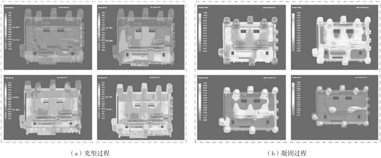 整體澆注系統設計示意圖如圖1所示,分型面設置在鑄件最大截面處,在底平面設置4個升液管,在鑄件頂部設置8個暗冒口。本工藝的設計理念為平穩快速充型、順序梯度凝固。通過升液管設計,快速充型的同時仍能保證液面平穩上升。再輔助以冒口設計,起到溢流集渣、排氣和改善凝固溫度場的作用。