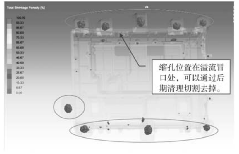 為了解決該問題,綜合考慮了鑄件力學性能和成形能力。將金屬型模具的預熱溫度提高到315 ℃,并基于數值模擬技術對鑄件進行分析。如圖9a所示,鑄件的充型過程平穩,無飛濺夾渣等行為。在圖9b中,給出了凝固階段符合順序凝固原則,自下而上,最后凝固區域位于冒口內部,鑄件整體補縮良好。對鑄件的縮孔縮松缺陷進行預測,如圖10所示。結果顯示燃料電池箱體鑄件的縮松/縮孔缺陷集中于冒口和澆道位置,因此可通過后期機加工去除。
