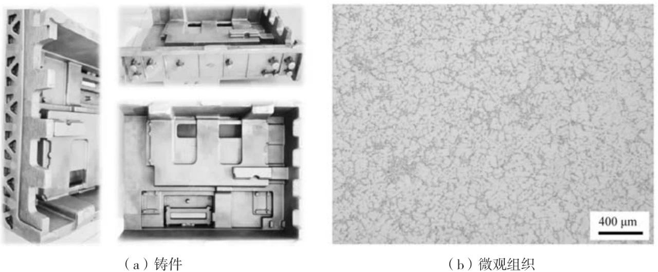 最終得到的合格鑄件如圖11a所示,鑄件毛坯表面質量較為光滑,粗造度為Ra12.5,滿足圖紙粗造度Ra25.4要求,尺寸形狀與金屬鑄型一致,鑄件表面未發現氣孔缺陷。鑄件金相組織如圖11b所示,可以看出凝固后鑄件組織致密,無氣孔缺陷。