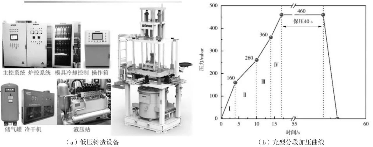 圖3 低壓鑄造設備及充型分段加壓曲線
