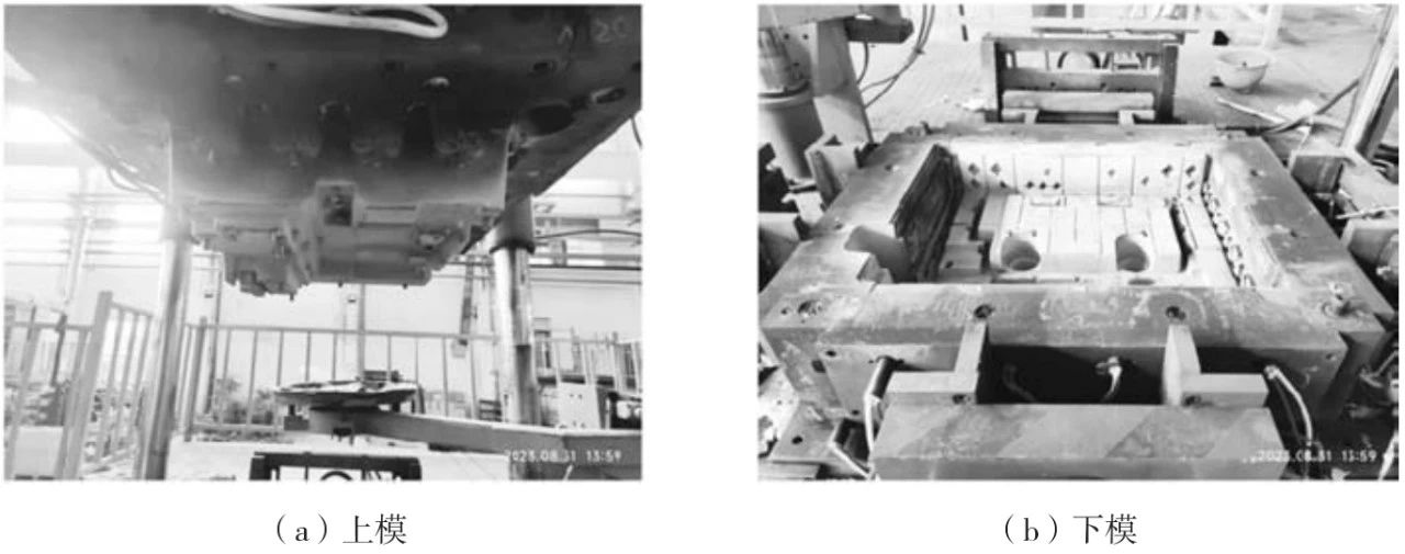 采用某型低壓鑄造機;模板尺寸:2 500 mm×1 800 mm×1 600 mm;開模力:17 t;頂出力:30~35 t;坩堝容量:800 kg;模具結構:四面抽芯、上抽芯頂出;升液管數量:4個。鋁液溫度:705~720 ℃;保溫爐氣氛溫度:740 ℃。低壓鑄造設備及分段充型加壓曲線如圖3所示,燃料電池箱體鑄件模具如圖4所示。