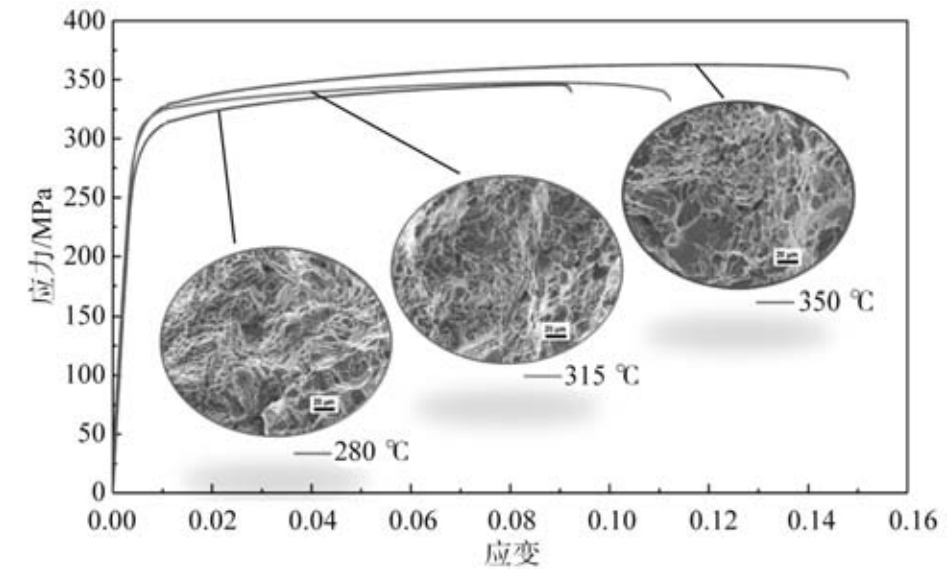 圖7為不同鑄型預熱溫度下隨鑄試樣T6熱處理后的性能對比。結果顯示隨著預熱溫度的提升,A356鋁合金的綜合力學性能逐漸下降。斷裂強度從280 ℃預熱時的341 MPa,下降到350 ℃預熱的329 MPa;屈服強度則從311 MPa下降到301 MPa;伸長率則由14.1%下降到8.5%。同時,拉伸斷口分析也證明280 ℃預熱下的斷口韌窩細小密集,而315 ℃預熱時韌窩尺寸增加,到350 ℃時則在斷口上發現部分解理面,表現為準解理斷裂特征。力學性能的結果與微觀組織表現出一致性。
