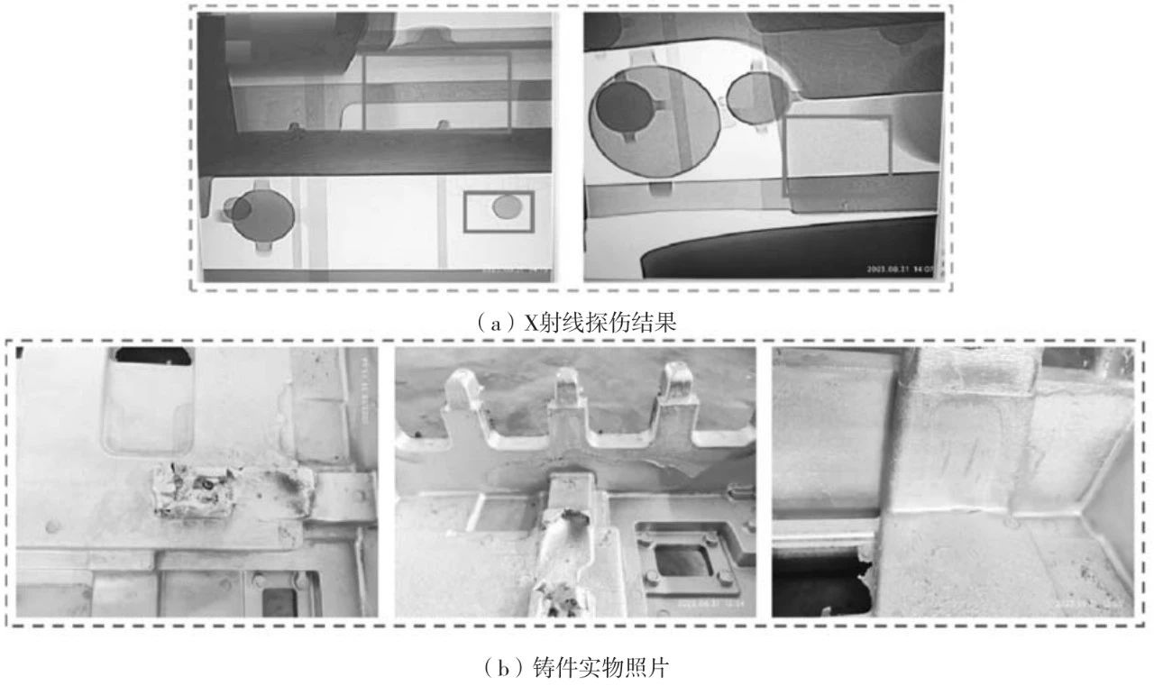根據上述分析結果,鑄件試制時選用的鑄型預熱溫度為280 ℃。但在實際鑄件的薄壁位置發現澆不足和冷隔缺陷,如圖8所示。此時,鋁合金液尚未填滿型腔,且液流前沿即使匯流也無法焊合在一起。究其原因,是由于該位置的型腔較薄(約2.5 mm),這導致在鑄型預熱溫度為280 ℃時,鋁合金液在充型過程中的溫度下降較明顯。當液流前沿到達該位置時,失去足夠的流動性。所以就在燃料電池箱體的薄壁位置留下大量冶金缺陷。