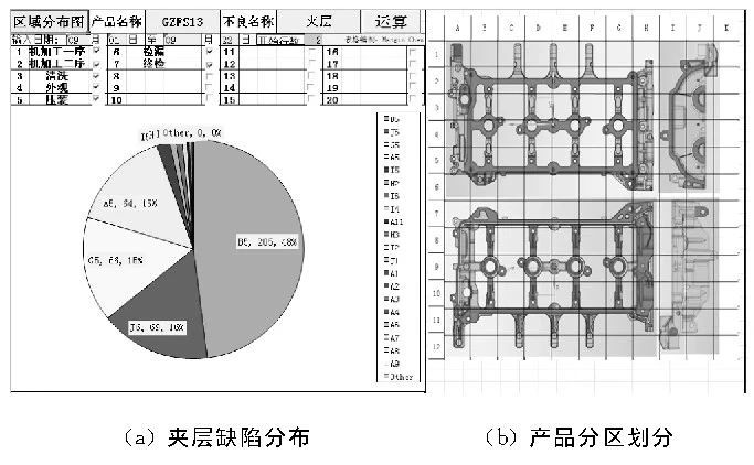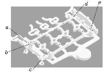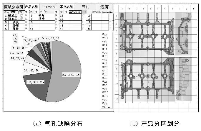 圖8 產品分區劃分及加工后廢品缺陷分布 凸輪軸支架生產過程出現的問題主要見圖9:①產品填充末端油道孔附近氣孔,機加工后油道孔與墊片安裝面氣孔外露;②φ18mm傳感器孔由于結構設計原因,很容易在該位置形成氣縮孔,實際生產中該孔機加工后報廢率也很高;③產品填充末端墊片安裝面與鏈條蓋安裝面氣孔,機加工后氣孔外露嚴重;④鑄件飛料嚴重,披縫很厚,產品清理與模面清理困難;⑤入料口右側墊片安裝面夾層;⑥入料口M6螺紋孔夾層;⑦入料口左側墊片安裝面夾層;⑧油道孔加工不過。