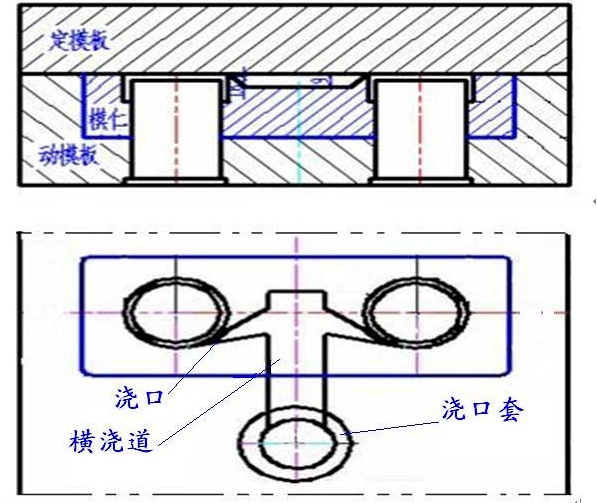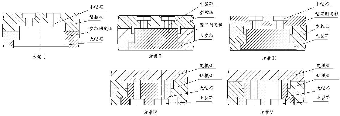 圖3 殼體分型面方案 (1)方案Ⅰ壓鑄模大型芯設(shè)在型芯固定板中,型腔和小型芯設(shè)在型腔板中,優(yōu)點(diǎn)是壓鑄件推出力小。缺點(diǎn)是壓鑄件2個(gè)φ6mm小孔與壓鑄件外圓φ56mm及內(nèi)孔φ48mm中心線的對(duì)稱度難以保證;壓鑄模分型面為壓鑄件下平面(裝配基準(zhǔn)面),上有飛邊,無法確保尺寸20mm及16mm的精度(見圖1),顯然此方案壓鑄件品質(zhì)難以保證。 (2)方案Ⅱ壓鑄模一部分型腔和大型芯放在型芯固定板中,壓鑄模另一部分型腔和小型芯放在型腔板中。缺點(diǎn)是壓鑄件2個(gè)φ6mm與鑄件外圓φ56mm及內(nèi)孔φ48mm中心線的對(duì)稱度難以保證,壓鑄模分型面設(shè)在有外圓的平面上,人為造成壓鑄件外圓有飛邊,鑄件外觀質(zhì)量差。 (3)方案Ⅲ壓鑄模型腔和大型芯設(shè)在型腔板中,小型芯設(shè)在型芯固定板中。優(yōu)點(diǎn)是鑄件飛邊不在鑄件安裝基準(zhǔn)面上。缺點(diǎn)是鑄件2個(gè)φ6mm小孔與鑄件外圓φ56mm及內(nèi)孔φ48mm中心線的對(duì)稱度有一定影響,但鑄件品質(zhì)基本能夠保證;以壓鑄件上平面做分型面,壓鑄件上平面上有飛邊。由于壓鑄件裝配時(shí)其飛邊被其他零件遮擋,故不影響鑄件在裝配后的外觀品質(zhì),此方案較為合理。 (4)方案Ⅳ壓鑄模型腔和大、小型芯全部設(shè)在動(dòng)模。優(yōu)點(diǎn)是可確保鑄件2個(gè)φ6mm小孔與鑄件外圓φ56mm及內(nèi)孔φ48mm中心線的對(duì)稱度。缺點(diǎn)是分型面設(shè)在壓鑄件下平面(裝配基準(zhǔn))上,鑄件裝配基準(zhǔn)面上有飛邊。此面為裝配基準(zhǔn)面,不能有飛邊,故此方案不合理。 方案Ⅴ壓鑄模一部分型腔設(shè)在動(dòng)模,另一部分型腔設(shè)在定模,大、小型芯全設(shè)在動(dòng)模。優(yōu)點(diǎn)是可確保鑄件2個(gè)φ6mm小孔與內(nèi)孔φ48mm中心線的對(duì)稱度。缺點(diǎn)是不能確保壓鑄件2個(gè)φ6mm小孔與壓鑄件外圓φ56mm中心線的對(duì)稱度,且以φ5mm外圓面做分型面,人為造成壓鑄件外圓面上有飛邊,外觀品質(zhì)差。綜合上述分析,選擇方案Ⅲ,以殼體上平面作分型面。