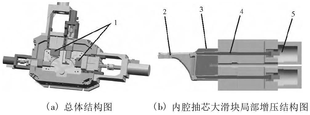 1.內(nèi)腔抽芯大滑塊 2.鑄件 3.滑塊 4.擠壓桿 5.擠壓油缸