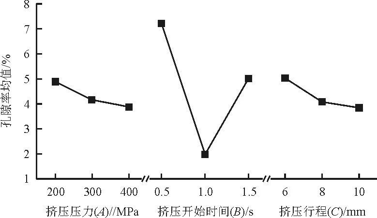 通過對發(fā)動機(jī)支架擠壓工藝的分析,可以確定影響鋁合金發(fā)動機(jī)支架局部增壓后內(nèi)部品質(zhì)的關(guān)鍵工藝參數(shù)為擠壓壓力、擠壓行程和擠壓開始時間,將其作為影響因素。每個因素取3個水平,通過局部增壓機(jī)構(gòu)結(jié)構(gòu)設(shè)計時的計算以及經(jīng)驗數(shù)據(jù),確定擠壓壓力為200~400MPa, 擠壓桿的擠壓行程為6~10mm, 擠壓開始時間為0.5~1.5s。正交試驗因素及水平見表1。正交試驗以孔隙率的檢測值做為評價指標(biāo)。為保證試驗數(shù)據(jù)的穩(wěn)定性,每組工藝參數(shù)連續(xù)壓鑄20模次,取中間模次的3件進(jìn)行孔隙率檢測,并取平均值。鋁合金發(fā)動機(jī)支架正交試驗表及孔隙率檢測結(jié)果見表2,極差值分析見表3。擠壓開始時間對鑄件孔隙率影響最大,其次為擠壓行程和擠壓壓力。為更直觀反應(yīng)不同因素對鑄件孔隙率的影響趨勢,以試驗因素做為橫坐標(biāo),以孔隙率平均值做為縱坐標(biāo),得出孔隙率隨各試驗因素變化的影響趨勢。