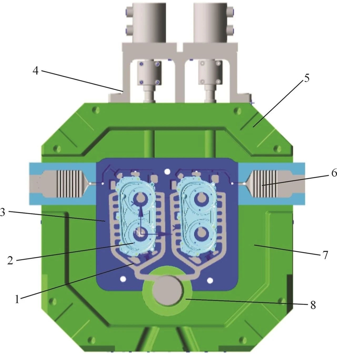 表1 溢流槽容積推薦值 壓鑄模排溢系統主要包括溢流槽和排氣道,可以控制金屬液的充填和流動狀態,合理的布置排溢系統能夠有效地減少冷隔、流痕、氣孔等鑄造缺陷。溢流槽和排氣道的設計與鑄件結構、澆注系統結構和尺寸等因素有關。溢流槽的位置一般布置在分型面上,選擇金屬液最先沖擊的位置、最后充填的位置以及多股金屬液匯集的位置,排氣道設置在溢流槽的后端,加強溢流和排氣的效果。 鏈條罩蓋模具結構見圖3,鑄件一模兩腔立式排放,通過鎖模力的計算,選擇鋁臺精機9000kN壓鑄機。壓室位于模具中心下方偏心200mm的位置。為滿足鑄件側向吊裝孔的成形,采用液壓側向抽芯機構,在模具上方布置液壓缸,用于實現吊裝孔嵌件的定位。由于鑄件型腔形狀相對簡單,模具成形零件采用整體式鑲塊結構,簡化模具結構的同時有利于冷卻水道的布置。動定模套板是成形零件、導向零件及側向抽芯機構的載體,并承受壓鑄時壓射力沖擊,采用整體式結構,在保證使用功能及強度的前提下,使模具結構更簡單、緊湊。推出機構采用推桿推出,由于鑄件為扁平類鑄件,推桿的布置盡量使鑄件各部位所受推出力均衡,以防止鑄件變形。因此在滿足推出力的前提下,增加推桿數量,在動模鑲塊每個型腔上設置30處直徑為?8mm的推桿,其中型腔16處、澆道9處、溢流槽5處。冷卻系統根據鑄件結構、位置的變化采用循環水冷卻和單點水冷配合使用。