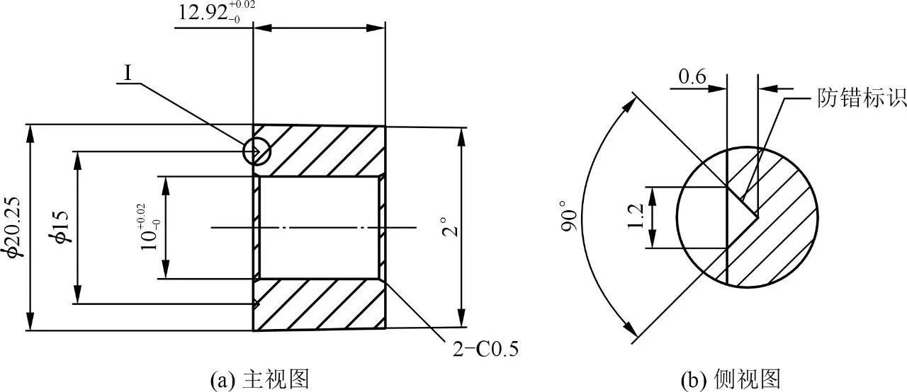 圖5 嵌件 吊耳處?20mm的吊裝孔附近局部體積厚大,充型緩慢,容易引起滯氣及收縮缺陷。為減少吊耳厚壁處的縮孔縮松,提高鑄件內部品質,采用嵌鑄工藝。嵌鑄是把金屬零件(嵌件)先放在壓鑄模內,再與壓鑄件鑄在一起,以消除鑄件局部熱節,減小鑄件壁厚,防止縮孔產生。由于該鏈條罩蓋外形結構較簡單,鑄件在最大輪廓處分型后,兩側包緊力沒有明顯的差異,因此在確定分型面后,將鏈條罩蓋吊耳孔處需要設計側抽芯結構的成形部分設計在動模,同時將周邊法蘭面上的預鑄孔型芯也設計在動模,可以增大動模部分的包緊力,避免開模后鑄件留在定模型腔。這種分型設計導致嵌件放置在動模型腔中,為保證嵌件在壓鑄過程動模移動時穩定牢靠,必須設計可靠的定位和壓緊方式。