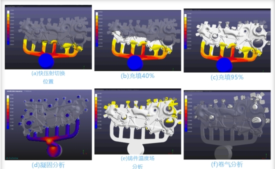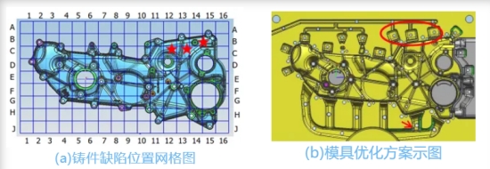 圖6 試模后的改善方案 結論 根據前蓋的結構特點,應用數值模擬,確定前蓋采用側向分支澆道進行充填,側澆道布置在分型面上鑄件的長邊方向,排溢系統設計在金屬液的充填末端及多股金屬液匯流的位置,整個充填過程平穩,無紊流及裹氣。澆注系統的設計順序為先設計內澆口再設計直澆道和橫澆道,之后根據澆道和鑄件結構進行溢流系統的設計,經過理論計算、模擬分析、試模調整,最終確定的澆注系統和排溢系統具體位置、形狀及尺寸。經批量生產驗證,產品品質高、模具運行穩定可靠。