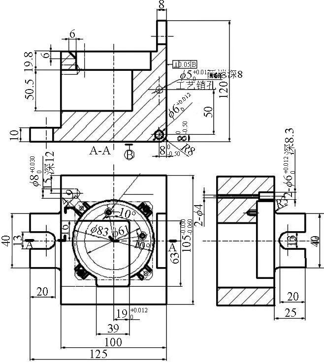 圖4 夾具體 結論 零件為壓鑄毛坯件且形狀不規則,所采用的一面兩銷定位和端蓋散熱槽轉位壓塊夾緊裝置是理想的選擇,巧妙地利用了壓鑄件尺寸一致性好的特點,使低精度的IT10孔距安裝孔作為定位孔,防止了薄壁端蓋零件若強行采用三爪或平口鉗等通用夾緊方式所導致的零件變形。將夾具體5設計成可90°翻轉的活動母體,輕松完成一次裝夾銑削相互空間正交的兩個軸承孔。選擇開口墊片作為重要的夾緊原件,避免了必須將壓塊螺釘全部旋出。取夾具體5俯視圖轉軸孔右、下兩面交匯處的圓角為8mm,若小于其定位尺寸8mm,則夾具體翻轉時將會出現卡死現象。 端蓋零件難以在加工中心上用鋁塊毛坯完成銑削,壓鑄是較為合適的選擇,但壓鑄精度僅為IT10左右,為了將某些關鍵部位的尺寸精度提升一個數量級,機床夾具的設計及其應用尤為關鍵。