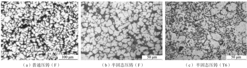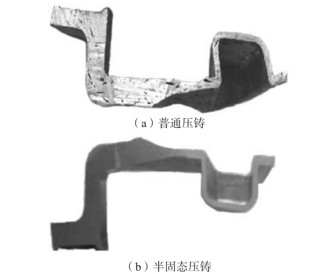 圖7 五段速度射出模式B壓射過程的模擬結果 3 生產驗證 根據五段速度射出模式B的壓射工藝曲線,應用勻加速料筒孕育半固態流變壓鑄工藝進行扣手鑄件的實際生產試驗,并同單段低速射出模式的普通壓鑄產品進行了比較分析。鋁合金液澆注溫度為640 ℃,壓射沖頭的最高低速速度為0.7 m/s、高速速度為2 m/s,模具預熱溫度為200 ℃。采用該壓鑄工藝獲得了外形輪廓清晰、表面光滑、尺寸精度高、無缺陷的扣手壓鑄件,如圖8所示。通過對壓鑄件進行解剖分析可以看到,采用普通壓鑄工藝的鑄件剖面存在大量的氣孔缺陷,如圖9a所示;而半固態壓鑄件的剖面沒有發現氣孔,如圖9b所示,另外通過對鑄件整體的X光透射探傷表明,扣手鑄件內部無明顯縮松、縮孔、氣孔和氧化夾雜等缺陷。圖10為扣手鑄件的鑄態和T6的微觀組織。從圖中可以看出,初生α-Al相呈近球狀,晶粒細小,分布均勻,具有較明顯的半固態組織特征。另外還對鑄件進行了T6處理和焊接試驗,經過535 ℃、8 h的固溶處理后,可以明顯看到,普通壓鑄件表面存在較多的鼓泡現象,而半固態鑄件表面沒有發現,如圖11所示;同樣,在焊接后普通壓鑄件的焊縫附近存在鼓泡現象,而半固態鑄件不存在,如圖12所示。由此可見,采用勻加速料筒孕育半固態流變壓鑄工藝進行壓鑄件的生產,可以有效消除普通壓鑄件的內部氣孔問題,實現了壓鑄件的T6熱處理和焊接加工。