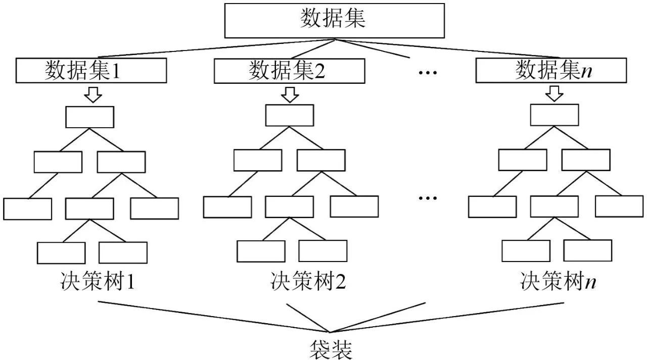 本研究通過Matlab R2021a軟件中集成的K近鄰、支持向量機、袋裝樹以及BP神經網絡模型對數據集進行訓練與測試,并通過超參數調節,分別獲得了各模型最優的訓練結果。模型超參數與預測準確率見表2。可以看出,4種模型均能獲得極高的訓練集準確率,表示此4種機器學習模型均具備極高的高緯度非線性分類能力。但是K近鄰、支持向量機以及BP神經網絡3個模型的測試集準確率卻非常低下,產生了較為嚴重的過擬合,缺乏對未知數據的泛化推廣能力。相對而言,袋裝樹模型的測試集準確率達60.9%,泛化能力顯著高于其他幾種機器學習模型。袋裝樹模型屬于集成學習方法的一種,原理見圖2。該模型利用多個決策樹模型(Decision Tree)分別對多個子數據集進行訓練學習,通過投票的方法進行袋裝(Bagging),將多個準確率低下的弱分類器組合成一個具有較強準確率的強分類器。和BP神經網絡、支持向量機等單分類器模型相比,集成算法有效減少了數據波動的隨機性與高噪聲所帶來的準確率下降,也減少了過擬合的風險,從而提升了模型總體預測準確性與泛化能力。因此,本研究選擇具有最優預測能力的袋裝樹模型作為關鍵工藝參數分析的預測模型。