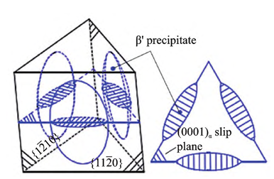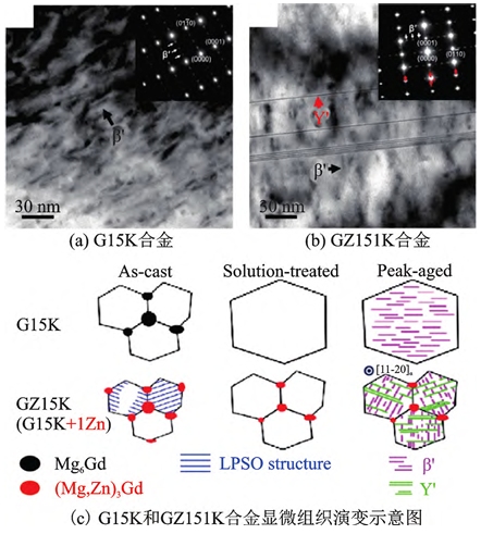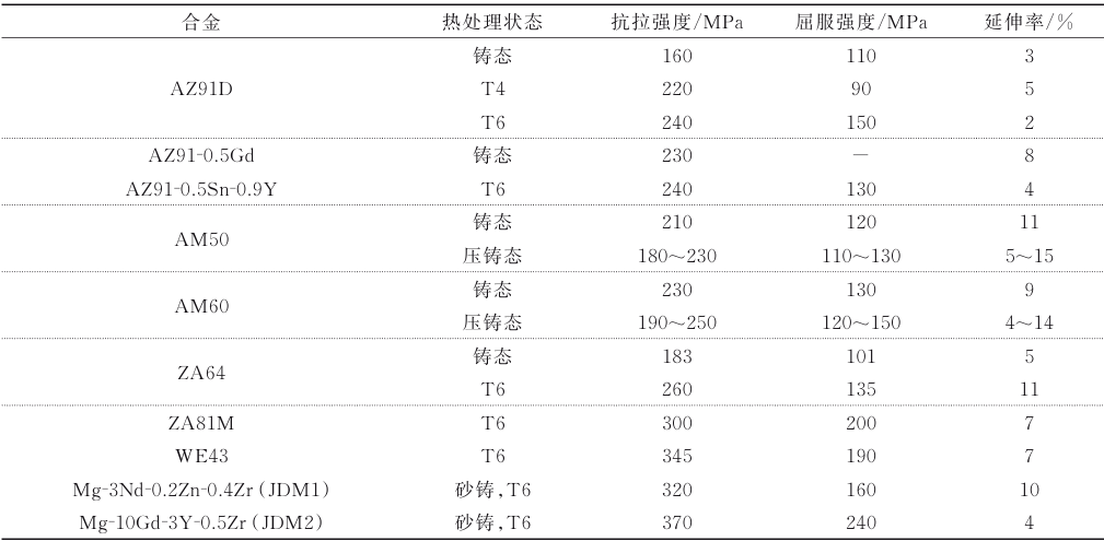 圖8 Mg-Y系合金時效析出強化模型 Mg-Gd系鑄造鎂合金中添加Zn,Y和Nd等合金元素形成三元或多元合金,力學性能更高,抗拉強度甚至可以超過350 MPa。在Mg-Gd系添加Zn 元素時,合金的時效析出序列會發生變化,當合金中 Gd的質量分數在6%以下時,析出序列為:SSSS→ γ??(hcp-Mg70 Gd15 Zn15 )→ γ?(hcp-MgGdZn)→ γ(hcp Mg12 GdZn)。γ?相在 α-Mg基面上形成,可以提高合金的峰時效硬度。而在Gd含量較高的合金中添加Zn時,析出強化來源于在基體棱柱面析出的β? 相與基面析出的γ?相的復合作用,合金力學性能進一步提升。Rong等在Mg-15Gd-0.4Zr合金中添 加1%Zn(質量分數)后,峰時效態合金的屈服強度從232 MPa提高至288 MPa,抗拉強度從296 MPa 提高至403 MPa,這是因為γ?和β?相在基體中相對垂直分布,對基體產生了復合強化作用,其組織形貌如圖9所示。此外,上海交通大學在Mg-Gd合金基礎上開發出高強耐熱鑄造 Mg-10Gd-3Y-0.5Zr (GW103K,JDM2)合金,在低壓鑄造或重力鑄造時有較好的流動性和抗熱裂性,合金經固溶和時效處理后,合金室溫力學性能大大提高,屈服強度高達 240 MPa,延伸率為6%,在300 ℃高溫下屈服強度仍能保持很高水平,對航空航天、軍工等領域輕量化作出極大貢獻,已被應用于輕型導彈殼體及雷達部 件等制備。 Gd 元素在α-Mg中的極限固溶度高于Y,從 548 ℃降溫至200 ℃時,其固溶度從23.5%降至4% (質量分數),因此對Mg-Gd合金進行時效處理,基體可析出大量納米相,帶來顯著的時效硬化效果。Mg-Gd的時效析出序列與Mg-Y系完全相同,峰時效態下主要是β?與β??或β?與β1 兩相共存狀態,合金具有較強的室溫屈服強度。 輕稀土元素Nd在α-Mg中的極限固溶度約為 3.6%(質量分數),也可使鎂合金產生較強的析出強化效果。Mg-Nd 系合金的時效析出序列為:SSSS→β??(DO19-Mg3 Nd)→β?(fcc-Mg3 Nd)→β(bct Mg12 Nd),β??為合金峰時效態下的主要強化相,該相與鎂基體完全共格,二者位向關系為:(0001)β?? // (0001)Mg ,β?? //Mg 。β??相的熱穩定性較高,可以提高Mg-Nd合金的高溫穩定性和耐熱性。然而,Nd元素在Mg中的生長限制因子Q值較小,對鎂合金起不到明顯的細化效果,因此Mg-Nd 合金的鑄態晶粒通常較粗大,無法作為結構材料進行服役,通常需要額外添加Zr或Zn等元素以細化晶粒、改善鑄造性能。上海交通大學在高強耐熱 ZM6合金基礎上調整了Nd/Zn比,開發出性能優良且成本低的Mg-3Nd-0.2Zn-0.4Zr(JDM1)鎂稀土合金,該合金兼具較好的鑄造性能和力學性能,已被應用于汽車輪轂、發動機支架等零部件上。 上述常見的幾類鑄造鎂合金系列及其性能特點整理在表3和表4中。在實際生產中,需要根據鑄件的使用工況來選取合適的合金材料?,F有的合金系列均存在一些性能和應用瓶頸,因此優化合金成分, 開發新型合金已成為鑄造鎂合金的重要研究方向 之一。