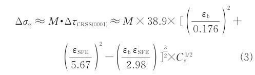 表5 常見二元鎂合金生長限制因子Q的數值 由表5可知,添加Zr,Ca和Si等Q值較高的溶質元素可以有效細化鎂合金晶粒。Fe元素雖然Q 值最高,但對鎂合金耐腐蝕性能有著不利影響,因此一般不考慮以Fe作為鎂合金的合金元素。Zr元素的Q值僅次于Fe,其晶體結構為密排六方晶格,將 Zr添加于不含Al和Mn的鎂合金(如Mg-RE,Mg Zn-RE等)中可顯著細化晶粒;而Zr和Al,Mn, Si,Fe等元素極易發生反應形成穩定的金屬間化合物,這些化合物通常在凝固后期形成,不能作為形核核心細化組織;Zr的額外消耗導致其細化效果進一步降低,雙重作用限制了Zr在含Al和Mn等鎂合金中的應用。Ca元素的Q值也較高,且Ca與Al會 反應原位生成Al2 Ca,與Mg的晶格匹配度較高,可以成為鎂基體的有效異質形核核心,在Mg-Al系合金中作為晶粒細化劑有很大的應用潛力,近些年也得到廣泛研究。除表5中所列元素外,Wang等在AZ31鎂合金中添加0.01%Ti(質量分數)后,晶粒尺寸顯著降低;經過計算得到Ti的Q值為59500,比 Mg-Zr體系中的生長限制因子高4個數量級,表明 Ti作為溶質元素其極高的成分過冷能力導致了 AZ31合金的高效晶粒細化。 還有一些元素會和鎂合金熔體中其他溶質元素發生反應形成穩定的金屬間化合物,這些顆粒有些可作為凝固過程中的形核核心,有些則會偏聚于晶界阻礙晶粒長大,最終起到晶粒細化效果,如添加 Mn和RE元素等。Mn是為數不多的能與Mg發生包晶反應的元素之一,因此雖然Mn的Q值很低, 但仍被作為鎂合金的細化元素被廣泛研究,但Mn 通常在熔體過熱處理后才能起到精煉作用,向AZ91 合金中添加少量Mn,在過熱反應后可以顯著細化晶粒。向鑄造鎂合金中添加一些稀土元素,往往也能起到明顯的晶粒細化效果。Wang等在Mg-Al 體系中添加La,Pr和Ce后,鑄錠晶粒顯著細化,這主要歸因于固-液界面前沿RE元素偏析對晶粒生長的限制,這一假設基于在鑄造鎂合金晶界上觀察到的含RE的金屬間化合物。Chia等也支持這一觀點,他們在Mg中加入La,Ce和Nd,得到了相似的晶粒細化結果。 除加入合金元素外,在低壓鑄造鎂合金熔體中加入作為晶粒細化劑的固體顆粒或原位生成顆粒, 可以增加凝固過程中形核晶粒的數量以起到晶粒細化的效果。對于Mg-Al合金而言,加C是一種有效的晶粒細化方法,在工業上已有成熟應用,但人們對其晶粒細化機理還不清楚。該方法僅在添加鋁(通常Al含量大于2%)的鎂合金中有效,且Be,Zr,Ti 和稀土元素的存在對晶粒細化有不良影響。在Mg Al合金中添加SiC顆??梢越档途Я3叽?,但其機 理尚不明確。一些研究者認為,當SiC加入熔體中 時,形成了Al4 C3 ,并起到形核劑的作用;另一些研究者則認為Al2 MgC2 起形核劑的作用;還有人認為Mg 顆粒直接在SiC顆粒上形核。Liu等研究發現在 Al-Ti-C 中間合金中,TiC顆粒總是依附在Al4 C3 顆 粒周圍,形成Al4 C3 +TiC顆粒團,試驗表明該顆粒團對純鎂有顯著的細化作用。除上述之外,Al-Ti-B 細化劑,NbB2 ,ZrB2 ,Mg24 Y5 ,TiB2 等顆粒及稀土等在 含鋁低壓鑄造鎂合金里也展現出良好的晶粒細化效果,但晶粒細化效果還有待進一步提高。 近年來也報道了適用于含鋁和不含鋁鎂合金低壓鑄造的快速凝固技術、超聲波晶粒細化技術和高強熔體剪切晶粒細化技術。快速凝固技術可以使鑄件在凝固過程中的冷卻速度加快,從而抑制晶粒的長大,鑄件的冷卻速度越快,晶體的生長時間越短, 晶粒的尺寸就會變得更小,因此,低壓鑄造快速凝固技術可以有效細化鑄件的晶粒結構。高強熔體剪切晶粒細化技術通過在熔體中產生大量的MgO作為 形核劑而有效地細化晶粒。 綜上所述,盡管研究工作已經進行了幾十年,但仍然沒有一種經濟可靠的晶粒細化技術可用于工業生產。因此,有必要進行更多的研究工作,如進一步了解鐵、錳等雜質對含鋁鎂合金晶粒細化的影響,研究不同方法的晶粒細化效率與鎂合金純度的關系等,尋找鎂合金微觀組織細化的新方法,以擴大鎂及其合金的應用。 4.2 固溶強化 固溶是合金元素在鎂合金中的重要存在形式,溶質原子固溶于Mg基體中,會引起系統能量的升高,同時增加滑移變形的阻力,最終導致基體強度增加,起到固溶強化效果。鎂合金的固溶強化效果由尺寸錯配度εb 、化學錯配度εSFE 及溶質原子濃度Cs 決定,其中εSFE 根據廣義堆垛層錯能(Stacking Fault Energy)的變化計算。由于密排六方(hcp)金屬下的主要滑移方式為基面滑移,根據第一性原理近似表示鎂合金的固溶強化效果Δσss :