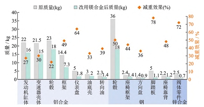圖3 電磁泵低壓鑄造工藝原理圖 此外,吳國華等結合涂層轉移制芯技術、坩堝液體金屬密封技術與低壓鑄造技術,創新性開發出大型鎂合金鑄件精密低壓鑄造成型新工藝,保證了鎂合金液的高純度和高凈度。所制造的鎂合金鑄件組織致密、尺寸精度高、表面質量好,且已具備100 kg鎂合金鑄件研發與小批量試制能力。 2 鎂合金低壓鑄造的發展現狀 早在20世紀初,英國就提出了低壓鑄造技術, 并將該技術應用在鎂合金生產上,但受限于當時技術和設備,一直未得到大規模應用。第二次世界大戰后,汽車工業開始快速發展,對汽車輪轂等零部件的需求量不斷增加,而這類零部件也適合用低壓鑄造工藝生產,進而該技術得到迅速發展,但設備和技術僅掌握在少數發達國家手中。20世紀中葉后,各 國開始投入人力物力對低壓鑄造技術的原理和工藝進行了深入研究,隨全球化進程和科技發展,低壓鑄造的設備也在不斷升級,其應用范圍更加廣泛,現已大量應用于航空航天、汽車及各類機械產業中。 以低壓鑄造鋁合金輪轂為例,其在20世紀80年 代的市場占有率僅為4%,但到了21世紀初其市場占有率便擴大至60%以上。目前低壓鑄造已成為生產鋁合金輪轂最主要的工藝。為進一步加速汽車輕量化進程,各國廠家與研究者正加快鎂合金輪轂的研發與生產,以替代鋁合金實現更深入的輕量化,研究主要聚焦于新材料、新工藝上。研究表明, 若要獲得與鋁合金輪轂相同的剛度,鎂合金輪轂的壁厚僅需增至鋁合金輪轂的1.17倍,此時其質量也僅為鋁輪轂的78%,具有明顯輕量化效果;在新能源車上用鎂合金輪轂代替鋁合金輪轂,車輛續航能力可以提高8%以上,汽車加速性能和減振效果也得到明顯提升。目前用于鎂合金的鑄造工藝有重力鑄造、高壓鑄造、擠壓鑄造以及低壓鑄造等。其中,低壓鑄造因其充型平穩和順序凝固等特點在鎂合金零件制造上有獨特的優勢,在工業領域受到廣泛的關注。但通過低壓鑄造技術生產鎂合金輪轂仍有待深入研究和改進,技術還不成熟,沒有得到廣泛推廣和應用。 進入21世紀以來,隨著計算機技術的發展,數值模擬技術被廣泛地用于低壓鑄造工藝的開發和優化。利用軟件對鎂合金的鑄造過程進行數值模擬, 可以提前預測出鑄件中產生的氣孔、疏松及夾渣等缺陷的出現位置及原因,縮短產品工藝開發的周期, 減少試模次數,降低生產成本。李靜怡等采用 鑄造模擬軟件EasyCast和NovaCast對鎂合金隔板鑄件低壓鑄造工藝過程進行數值模擬,發現隔板鑄件凝固過程未遵循順序凝固原則并有縮孔產生,通過添加冷鐵進行工藝改進,有效加強補縮效果,改善了縮孔缺陷。張華等基于AnyCasting鑄造模擬軟件分析了AZ91D鎂合金輪轂的鑄造過程,精確定位鑄造缺陷的部位并找出缺陷產生的原因,進而對鑄造工藝進行了優化,減少了試模次數,從而大大降低了成本;數值模擬的結果也為鎂合金輪轂的低壓鑄造提供了理論指導與依據,促進了低壓鑄造鎂合金輪轂的工藝開發和生產進程。 近年來,新能源汽車快速發展,為汽車工業輕量化提出了更高的要求?!吨袊圃?025》提出了汽車發展的整體規劃,輕量化已經成為世界各國汽車廠商最新核心的發展目標之一,圖4為鎂合金對汽車零部件的減重效果。純電動汽車重量每降低10%,續航里程便可增加約6%,而車輛的電池包系統重量占整車20%以上,成本占整車高達30%~ 60%,在動力電池系統中,電池殼占系統總重量約 2%~30%,是主要的結構件,因此在保證電池系統功能安全和車輛整體安全的前提下,電池殼的輕量化已經成為電池系統主要改進目標之一?!朵X鎂合金鑄件行業市場現狀研究報告》指出,當前鎂合金鑄件具備替換鋁合金鑄件在汽車輕量化領域應用的三大條件,即:鎂合金的密度約為鋁合金的2/3,且比強度高于鋁合金及鋼材,使用鎂合金替代鋁合金可實現25%~35%的減重率;鎂鋁價格比回落至1.3 區間內,“鎂代鋁”經濟上更具性價比;鎂合金在抗振、散熱、強度等方面具備優勢。2022年國內單車鎂合金用量僅3~5 kg,對比鋁合金單車100 kg以上的用量,發展潛力巨大。智己L7車型全套電驅動系統殼體是鎂合金材料在新能源電驅動殼體上的首次量產應用,這也是目前在國內外汽車領域量產應用的最大的鎂合金零組件之一。隨后,上汽也開發了多款鎂合金新能源電驅總成產品,并成功量產,加速拓寬了鎂合金新的應用場景,也預示了鎂合金在新能源汽車上的美好應用前景。隨著新能源汽車性能逐步提升,對電驅殼體、電池托盤等部件的輕量化和性能要求也有所提高,對低壓鑄造可熱處理強化鎂合金部件的需求愈發緊迫。