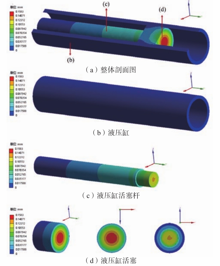 圖8 壓射室部分等效應變云圖 3.2 液壓缸部分變形、應力和應變分析 液壓缸部分產生的變形云圖如圖9所示。液壓缸由于處于固定支撐約束,因此其變形幾乎為零,可以忽略不計。液壓缸活塞桿受到來自液壓缸活塞傳遞過來的增壓力,在右端產生了變形。液壓缸活塞桿在與液壓缸活塞接觸的地方所產生的變形最大,達到了0.141 mm,僅在中心部位的較小面積范圍內達到了最大變形值。在右端接觸面上,沿著徑向方向向外,變形值逐漸減小,在最外圈達到最小值,約為0.088mm。在液壓缸活塞桿的長度方向上,變形量從右至左逐漸減小。液壓缸活塞由于受到來自右端增壓缸活塞桿的壓力,因此產生變形。液壓缸活塞與增壓缸活塞桿接觸的部分產生的變形最大,最大值為0.158 mm。沿著液壓缸活塞右端面的徑向方向向外,變形量逐漸將減小,活塞外圈部分產生的變形為0.035 mm。
