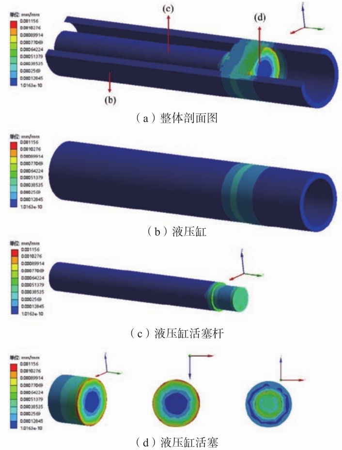 圖10 液壓缸部分等效應力云圖 應力沿桿的長度方向驟然減小。當距離右端面為整桿長度 的1/10時,應力值就減小到最小值,大約為0.2 MPa。液壓缸活塞右端受到增壓缸活塞桿的壓力,其等效應力從中心往外徑方向向外逐漸增大,活塞右端面中心處最小等效應力為24.4 MPa,邊緣處最大等效應力值為219.2 MPa。液壓缸活塞左端與液壓缸活塞桿接觸,其等效應力從中心處往外徑方向先減小后增大,中心處等效應力大小為121.8 MPa,然后減小到52.2 MPa,到達邊緣處時,其達到最大等效應力,約為170.5 MPa。 液壓缸部分所受等效應變云圖如圖11所示。液壓缸整體的等效應變較小,在與液壓缸活塞接觸的地方出現最大值0.000 39 mm/mm。液壓缸活塞桿右端面的等效應變由中心處往外逐漸減小,中心處等效應變為0.000 51 mm/mm,邊緣處等效應變為0.000 39 mm/mm。在液壓缸活塞桿長度方向上,距離右端面距離為整桿長度的1/10時出現最大值,大約為0.000 64 mm/mm。液壓缸活塞的右端面的等效應變值從中心處往邊緣處逐漸增大,中心處最小等效應變值為0.000 13 mm/mm,邊緣處最大等效應變為0.001 16 mm/mm。液壓缸活塞接觸液壓缸活塞桿的左端面,活塞的等效應變值先減小后增大,中心處的等效應變為0.000 63 mm/mm,然后減小為0.000 34 mm/mm ,再增大,到邊緣處時最大應變值為0.000 89 mm/mm。