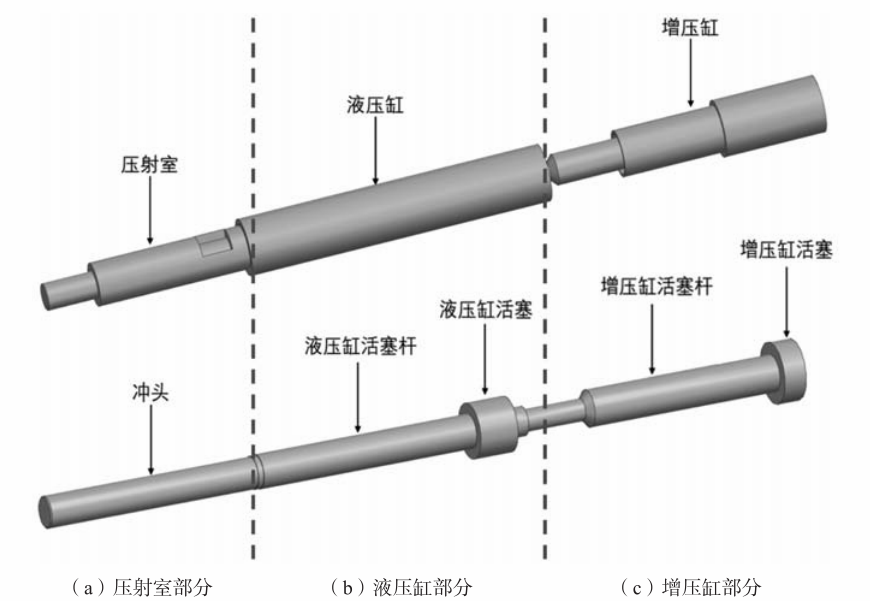 圖1 典型的壓射系統剖視圖 2壓射系統三維建模及靜力學仿真設置 2.1 壓射系統三維建模 壓射系統主體部分大致分為三個部分:壓射室部分(包括壓射室與沖頭)、液壓缸部分(包括液壓缸、液壓缸活塞以及液壓缸活塞桿)、增壓缸部分(包括增壓缸、增壓缸活塞以及增壓缸活塞桿)。使用SIEMENS NX 1899軟件將上述三部分分別進行三維建模,并完成裝配。圖2所示為本研究簡化后的用于數值模擬仿真的壓射系統三部分的裝配數值模型。