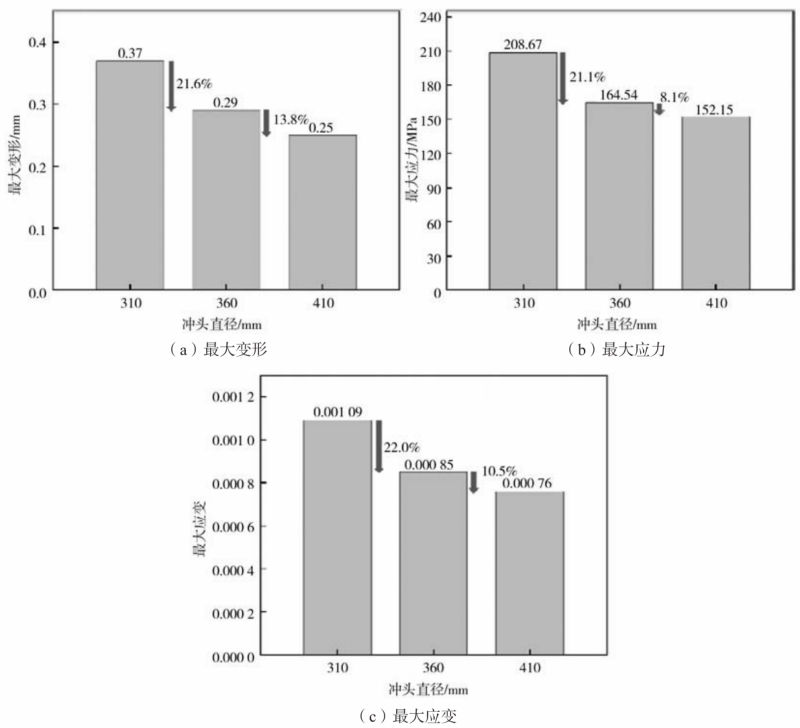 表2 壓射室、沖頭尺寸參數 對不同尺寸的沖頭和壓射室進行相同的受力設置,在相同的受力情況下(以組別2沖頭橫截面積乘以壓強100 MPa計算所得值為三組的共同受力值)進行模擬計算,組別1沖頭處換算壓強為134.86 MPa,組別2為100 MPa,組別3為77.10 MPa。如圖15所示為不同尺寸的沖頭的變形、應力和應變柱狀圖。由計算結果分析可知,隨著沖頭直徑的增大,沖頭產生的最大變形、最大應力以及最大應變均呈現減小的趨勢。沖頭直徑從310 mm增加到360 mm,沖頭產生的最大變形從0.37 mm減小到0.29 mm,減小了21.6%;最大應力從208.67 MPa減小到164.54 MPa,減小了21.1%;最大應變從0.001 09 mm/mm減小到0.000 85mm/mm,減小了22.0%。而當沖頭直徑從360 mm增大到410 mm,沖頭最大變形只減小了13.8%,最大應力減小8.1%,最大應變減小10.5%。由此可以看出,相同的受力情況下,進一步增大沖頭直徑,雖然會進一步減小沖頭所產生變形、應力以及應變,但其減小的幅度明顯降低。且進一步增大沖頭尺寸,會相應導致壓射室尺寸增大,從而帶來生產成本上升的問題。因此,在本研究中,綜合考量選擇360 mm為更優的尺寸,因為該尺寸在明顯降低了變形和應力應變值的基礎上,還保證了一定的經濟適用性,控制了成本。
