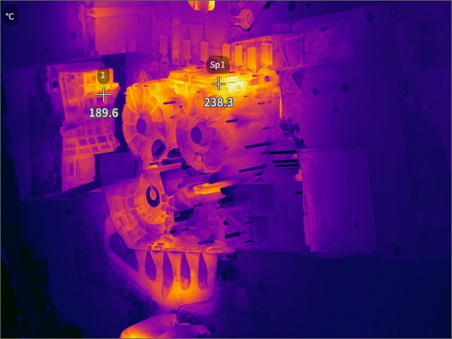 表3 模溫控制系統以高精度、高一致性和廣泛測溫范圍為核心技術特點,其性能上限充分體現了系統在復雜工業環境中的卓越適應能力和可靠性。以下關鍵參數具體描述了系統的技術性能和應用價值: 1、全量程測溫精度:系統實現了±2℃或±2%的測溫精度,能夠滿足壓鑄過程中對模具表面溫度監測的嚴苛要求。精確的測溫數據不僅有助于識別溫度異常點,還為模溫調節提供了可靠依據,有效避免因溫差波動引發的鑄件缺陷,如縮痕、裂紋和氣泡等; 2、測溫一致性:系統的測溫一致性高達±1℃或±1%,能夠確保不同時間和空間點的溫度數據始終保持高度一致。這種特性在壓鑄生產的連續性過程中尤為重要,能夠提供穩定的熱分布監測,為精準調控工藝參數提供支撐; 3、環境溫度適應性:系統能夠在-30℃至100℃的環境溫度范圍內穩定運行,適應壓鑄現場的極端工作環境。這種環境適應能力確保了系統在嚴苛條件下仍能提供可靠的測溫結果,為長期工業應用奠定了堅實基礎; 4、測溫范圍:系統的測溫范圍覆蓋了-20℃至650℃,全面滿足了模具從低溫預熱到高溫壓鑄的全過程需求。廣泛的測溫范圍使系統適合于多種不同工藝要求,具有更高的通用性和靈活性; 5、紅外像素分辨率:系統配備了640×480像素的紅外熱像儀,以其高分辨率實現清晰的熱成像效果。成像細節豐富,能夠直觀展現模具表面的熱分布狀態,為工程師提供精準的視覺分析工具。此外,高像素分辨率確保了測溫的點密度和分辨率,能夠準確測量直徑為10mm的小目標區域溫度。 通過上述關鍵參數,系統展示了其在壓鑄工藝中的卓越性能,具備實時、高效、精準的模具溫度監測能力。這些技術性能不僅有助于改善鑄件質量,還顯著提高了生產效率,降低了資源浪費和維護成本,為現代化壓鑄生產提供了強有力的技術支持。 3實驗驗證 3.1 實驗設計 在壓鑄生產過程中,模具溫度的控制至關重要,尤其是在噴涂后冷卻階段。通常,噴涂后的模具溫度應迅速降低至150℃左右,以確保良好的鑄件質量,并避免由于過高的溫度導致零部件局部的應力集中和裂紋生成。然而,在某一生產批次中,銷釘部位的溫度冷卻后仍然保持在216℃,遠高于理想溫度,進而導致生產出的零部件在該部位經常發生開裂現象。由于在之前的生產過程中未使用熱成像技術,生產團隊未能及時發現冷卻系統的問題,只有在零部件質量異常的情況下,才意識到該部位可能存在溫度控制問題。如圖1所示