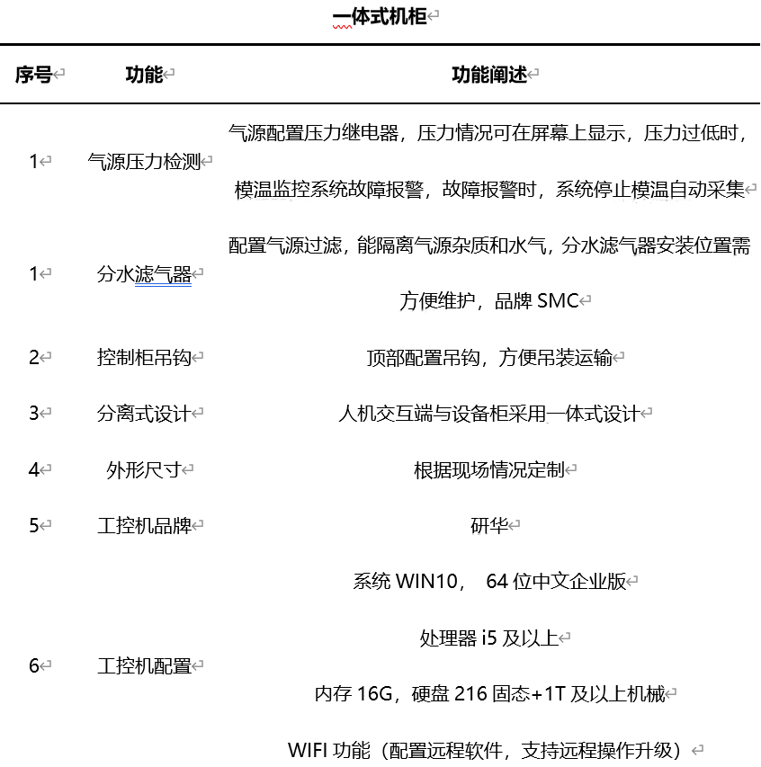 表2 2.3 一體式機柜 為保障模溫監控系統在工業現場的高效運行,系統采用功能齊全的一體式機柜設計,將各類關鍵部件和功能集成于統一結構中,兼顧便捷性和可靠性。機柜的設計細節充分考慮了壓鑄現場的實際需求,具備高性能、高耐用性和易維護性。機柜配備氣源壓力檢測裝置,通過壓力繼電器實時監測氣源壓力,檢測結果直觀顯示在屏幕上。當氣源壓力過低時,系統將觸發故障報警,并停止模溫自動采集,確保設備安全運行。機柜還集成了分水濾氣器,用于高效過濾氣源中的雜質和水氣,并便于維護。人機交互端與設備柜采用一體式設計,結構緊湊,頂部配置吊鉤,便于現場吊裝和運輸。根據現場需求,機柜的外形尺寸可定制,以適應不同的安裝環境。核心控制硬件為研華品牌工控機,預裝64位中文企業版Windows 10系統,配備i5及以上處理器、16GB內存、216GB固態硬盤和1TB機械硬盤,同時支持WIFI遠程操作及升級。交互界面采用飛利浦24英寸觸控屏,為用戶提供友好直觀的操作體驗。供電方面,機柜支持AC220V 50Hz動力電源和DC24V控制電源,可根據現場情況調整。系統設計有信號防干擾措施和短路保護功能,有效提升信號傳輸的穩定性和設備運行的安全性。此外,機柜配備三色報警燈,用于指示系統運行狀態。其他功能包括預留外部系統通訊的RJ45接口及額外的USB接口,滿足多樣化的外部連接需求。設備整體氣源要求不低于0.5 MPa,以確保系統運行的穩定性和可靠性。這款一體式機柜通過高集成度和優化設計,為模溫監控系統提供了堅實的基礎,能夠滿足壓鑄現場復雜環境中的多樣化需求。詳細的功能介紹如表3所示: