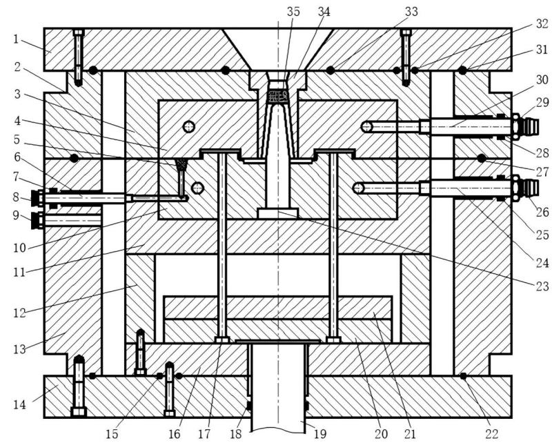 ![]() 原標(biāo)題:基于熱室壓鑄機(jī)的高真空壓鑄工藝設(shè)計(jì)與試驗(yàn)的研究 壓鑄件廣泛應(yīng)用于汽車、五金、通信等行業(yè)。提升壓鑄件的生產(chǎn)制造工藝以提高壓鑄件的制造品質(zhì),對壓鑄業(yè)十分重要。研究者們總結(jié)了提升壓鑄件品質(zhì)的兩種生產(chǎn)工藝法:真空截止閥法和激冷排氣槽法,并闡述了其結(jié)構(gòu)原理,在此基礎(chǔ)上介紹了兩種國外高真空壓鑄工藝:Vacuum GolveBox 法和MFT法。在普通壓鑄機(jī)上通過壓射過程中壓射沖頭的位置控制抽真空過程中真空閥的開閉,避免合金液流入抽真空系統(tǒng)。通過在模具型腔末端設(shè)計(jì)牙型排氣槽與真空排氣槽相連,使液態(tài)合金經(jīng)牙型排氣槽的阻擋作用后停止流動,避免合金液流入抽真空系統(tǒng)。在模具型腔末端設(shè)計(jì)了一種主副雙通道的抽真空通道,主通道的排氣截面大,由真空閥控制其開閉,副通道截面小且形狀為齒狀,以此增加液態(tài)合金流入其中后的流動阻力,避免合金液進(jìn)入抽真空系統(tǒng)。在實(shí)際工程應(yīng)用上,為了提高壓鑄件的成形品質(zhì),克服壓鑄件氣孔和縮松缺陷,提高壓鑄件的力學(xué)性能,企業(yè)普遍采用高真空壓鑄工藝,但存在的問題是模具型腔的密封性欠佳,同時伴有少量合金液被抽入抽真空系統(tǒng),導(dǎo)致生產(chǎn)的穩(wěn)定性不高,后續(xù)維護(hù)成本高。 本研究以MFT法和Vacuum GolveBox法為基礎(chǔ),在普通熱室壓鑄機(jī)上實(shí)施高真空壓鑄。通過對熱室壓鑄模具密封裝置、抽真空口通氣阻料裝置及抽真空壓鑄工藝流程進(jìn)行設(shè)計(jì),確保密封箱與模具型腔內(nèi)的真空度,從而實(shí)現(xiàn)穩(wěn)定的高真空壓鑄工藝。結(jié)合試驗(yàn)和實(shí)際生產(chǎn),分析該工藝方法對鑄件斷面特征及力學(xué)性能的影響,為制備高質(zhì)量壓鑄件提供參考。 圖文結(jié)果 實(shí)現(xiàn)高真空壓鑄工藝的關(guān)鍵技術(shù)有以下3點(diǎn):一是模具密封;二是模具中抽真空口機(jī)構(gòu)設(shè)置;三是抽真空流程設(shè)計(jì)。對于模具密封技術(shù),目前國內(nèi)普遍采用的方法是在模具上圍繞模具型腔進(jìn)行密封機(jī)構(gòu)設(shè)計(jì),常用的方法其關(guān)鍵是在模具分型面上、模具推出機(jī)構(gòu)及模具與壓鑄機(jī)射壓機(jī)構(gòu)等部位設(shè)計(jì)密封圈進(jìn)行密封,避免空氣進(jìn)入模具型腔。這種方法的優(yōu)點(diǎn)是無需單獨(dú)設(shè)計(jì)和制造密封裝備,其缺點(diǎn)是增加了模具的生產(chǎn)制造難度,縮短了模具的使用壽命。對于抽真空口機(jī)構(gòu)設(shè)計(jì),目前主要的方法有兩種:第1種是由基于杠桿原理的抽真空口控制裝置,該裝置是在模具抽真空口處設(shè)計(jì)由連桿連接的主從動活塞,抽真空時,型腔內(nèi)的氣體通過模具抽真口抽離,壓鑄時,當(dāng)合金液流經(jīng)主動活塞時,主動活塞通過連桿機(jī)構(gòu)帶動從動活塞閉合抽真空口,從而避免液態(tài)合金進(jìn)入抽真空系統(tǒng)。這種機(jī)構(gòu)的優(yōu)點(diǎn)在于結(jié)構(gòu)相對簡單、制作方便,缺點(diǎn)是生產(chǎn)時不斷有少量合金累積在主動活塞與活塞孔之間,造成活塞動作的不靈敏,導(dǎo)致合金液溢入抽真空系統(tǒng),從而造成生產(chǎn)的中斷。第2種是在模具抽真空處設(shè)置由液壓缸帶動的擋板開閉裝置,抽真空時,液壓缸帶動擋板打開抽真空口,當(dāng)模具型腔真空度達(dá)到要求時,液壓缸帶動擋板關(guān)閉真空口。這種結(jié)構(gòu)能極大地簡化模具結(jié)構(gòu),缺點(diǎn)是由于各種原因?qū)е碌囊簤焊走\(yùn)動不及時,使液態(tài)合金容易進(jìn)入抽真空系統(tǒng),從而造成生產(chǎn)中斷。抽真空的流程一般是在合模狀態(tài)下,先對模具型腔抽真空,當(dāng)真空度達(dá)到要求后,停止抽真空,然后再啟動壓射流程,將熔融合金壓入模具型腔中。其優(yōu)點(diǎn)是在壓鑄過程中,真空系統(tǒng)停止了對模具型腔的抽真空,其能有效避免合金液進(jìn)入真空系統(tǒng),其缺點(diǎn)是熔融合金在填充過程中,可能會混入少量氣體,從而影響鑄件成形品質(zhì)。 圖1為設(shè)計(jì)優(yōu)化后的熱室高真空壓鑄工藝結(jié)構(gòu)圖。其中,將模具整體密封于矩形密封箱內(nèi),密封箱主體結(jié)構(gòu)由定模密封箱底板1,定模密封箱套板2,動模密封箱底板14,動模密封箱套板13,圓環(huán)密封圈15、32、33,圓長條密封圈22、27、31等零件組成。其密封方案如下:將熱室壓鑄模具定模板3通過螺釘固定在定模密封箱底板1上,在其接觸面上設(shè)置圓環(huán)密封圈32、33;將動模底板16固定在動模密封箱底板14上,在其接觸面上設(shè)置圓環(huán)密封圈15;在動模密封箱底板14底端開設(shè)頂出孔,并在孔內(nèi)設(shè)置矩形密封圈18,壓鑄機(jī)推桿19經(jīng)頂出孔后再推動模具的推出機(jī)構(gòu)將壓鑄件推出模具型腔外;在定模密封箱套板2和動模密封箱套板13的接觸面上設(shè)置圓長條密封圈27;在定模密封箱底板1與定模密封箱套板的接觸面上設(shè)置圓長條密封圈31;在動模密封箱底板14與動模密封箱套板13的接觸面設(shè)置圓長條密封圈22,通過上述位置的密封設(shè)計(jì),除了模具與壓鑄機(jī)噴嘴接觸的進(jìn)料口外,基本實(shí)現(xiàn)了對模具其