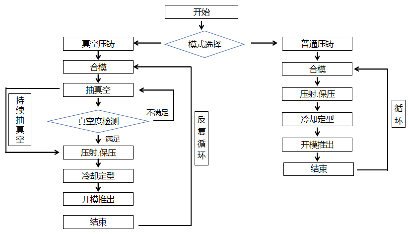 圖1 熱室高真空壓鑄工藝結(jié)構(gòu)圖 模具抽真空口是與模外抽真空系統(tǒng)的連接通道,其作用是對模具型腔抽真空,同時避免壓鑄合金液被吸入抽真空系統(tǒng)中,對高真空壓鑄生產(chǎn)的穩(wěn)定性起決定性作用。為了避免在模具中設(shè)計(jì)復(fù)雜的抽真空口開啟和閉合裝置,本工藝抽真空口的設(shè)計(jì)方案見圖1。在模具抽真空口前設(shè)置了具有通氣阻料功能的微孔塞5,其作用是抽真空時能讓模具型腔中的氣孔快速通入其中被抽離,壓鑄時能有效阻擋合金液進(jìn)入其中,避免合金液進(jìn)入抽真空系統(tǒng),該部件由酚醛樹脂加熱至熔融狀態(tài)后與細(xì)砂均勻混合后壓制而成,具有耐高溫、抗變形、透氣性好的優(yōu)異性能。 在生產(chǎn)實(shí)踐中,為了便于安裝,將微孔塞制成梯形圓臺狀。在動模鑲件10靠近產(chǎn)品型腔末端溢料槽位置的后面設(shè)計(jì)一個梯形圓孔,如果是大型的壓鑄件可在型腔多個位置設(shè)置多個梯形圓孔,將微孔塞放置其中,在圓孔的底部開設(shè)抽真連接通道,再通過型腔抽真空管6與動模密封箱套板13上連接抽真空系統(tǒng)的抽真空口8相連,同時在動模密封箱套板13上開設(shè)了專用于對密封箱內(nèi)部抽真空接口9。抽真空時,模具型腔內(nèi)的氣體通過抽真空接口8抽離,密封箱內(nèi)的氣孔通過抽真空接口9抽離。為防止外圍氣體進(jìn)入密封箱內(nèi),在型腔抽真空管6上設(shè)置矩形密封圈7,在用于控制模具溫度的接水管24、30上設(shè)置密封圈25、28。這種抽真空口設(shè)計(jì)的特點(diǎn)是通過對模具型腔及模具外圍同步抽真空,能有效地提升模具型腔的高真空度,同時進(jìn)一步簡化模具結(jié)構(gòu)設(shè)計(jì)與生產(chǎn)制造難度。 由于方案是在普通熱室壓鑄機(jī)上實(shí)施高真空壓鑄工藝,因此,在進(jìn)行高真空壓鑄生產(chǎn)前,需將抽真空系統(tǒng)與壓鑄機(jī)控制系統(tǒng)進(jìn)行系統(tǒng)集成。抽真空系統(tǒng)硬件結(jié)構(gòu)主要由電氣控制系統(tǒng)、電機(jī)、真空泵、真空罐、真空閥、真空度表、過濾器、傳感器、真空管道等零件組成。控制部分由PLC控制變頻器對三相異步電機(jī)的啟停及轉(zhuǎn)速進(jìn)行控制,從而控制真空泵實(shí)施抽真空工藝。 圖2為系統(tǒng)集成后的壓鑄工藝流程,分普通壓鑄模式和高真空壓鑄模式。在普通壓鑄模式下,按照壓鑄機(jī)現(xiàn)有壓鑄流程進(jìn)行壓鑄;在高真空壓鑄模式下,在壓鑄機(jī)開合模機(jī)構(gòu)的作用下,使密封箱及模具合模,當(dāng)傳感器檢測到合模完成信號后,傳輸信息至PLC控制系統(tǒng),當(dāng)PLC控制器接收完信息后,啟動電機(jī)運(yùn)轉(zhuǎn)并通過帶傳動機(jī)構(gòu)帶動抽真空泵對模具密封箱及模具型腔抽真空。當(dāng)真空度達(dá)到要求后,由PLC控制系統(tǒng)的數(shù)據(jù)通信功能與壓鑄機(jī)控制系統(tǒng)進(jìn)行信息交互,從而啟動壓鑄機(jī)的壓射流程。合金液在壓射機(jī)構(gòu)的作用下,經(jīng)模具直澆道、橫澆道、內(nèi)澆口后注入模具型腔內(nèi),保壓結(jié)束后通過真空閥停止抽真空,待壓鑄件冷卻后,通過在壓鑄機(jī)開合模機(jī)構(gòu)的作用下,使模具密封箱及模具處于開模狀態(tài)。通過壓鑄機(jī)推桿經(jīng)模具推出機(jī)構(gòu)將壓鑄件推出模外,再通過壓鑄機(jī)使模具密封箱及模具進(jìn)行合模,至此完成一個生產(chǎn)周期。