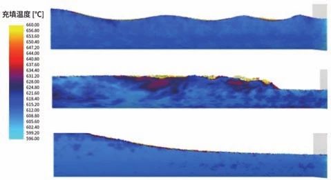 圖5 三種不同的壓射工藝曲線示意圖 采用SuperCAST智鑄超云分別模擬了三種不同慢壓射工藝(A 0.2~4.6 m/s、B 0.5~4.6 m/s、C 1.23~4.6 m/s)條件下料管內金屬液流動狀態,結果如圖6所示。方案A鋁液料管充填過程中運動呈波浪狀,鋁液出現翻滾現象,極易形成卷入性缺陷。同時,方案A鋁液在料管中留置時間較長且充填過程中金屬液體出現不規則波動,易導致鋁液熱量損失較多,并易使空氣進入金屬液體。方案B鋁液在料管充填過程中金屬液體出現不規則波動,容易使空氣和氧化夾雜裹卷入金屬液體。方案C鋁液在料管充填過程中界面前沿始終保持前傾狀態、波面運動平穩,沒有出現金屬液不規則運動,從而有效避免了將料管氣體卷入鋁液。綜上所述,方案A和B出現回流或翻滾現象易發生卷氣,同時金屬液溫度出現充填溫度較低和不均勻現象。方案C在料管中的運動平穩不易發生卷氣且金屬液溫度均勻。