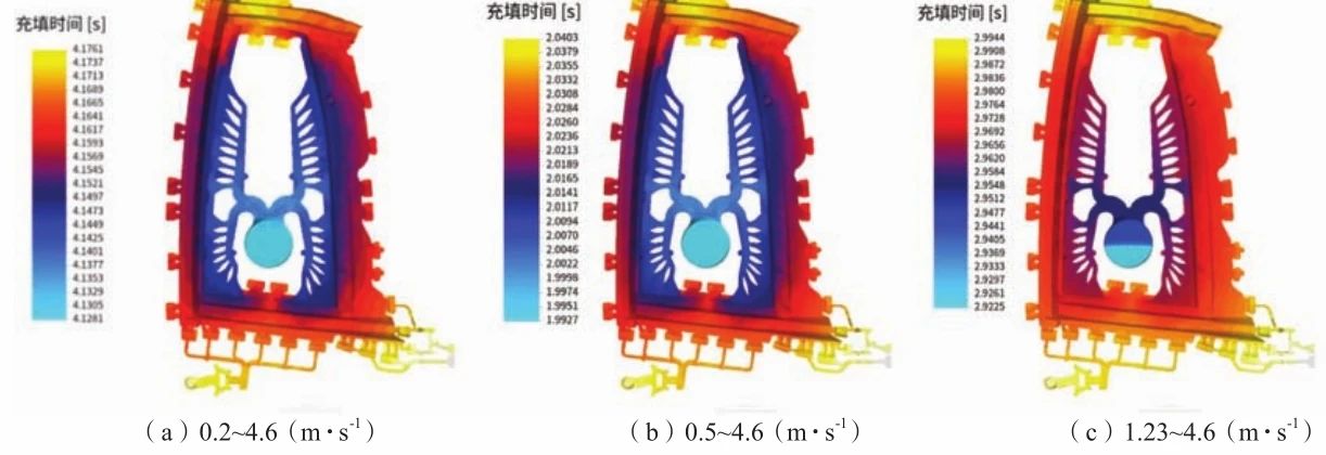 圖6 熔體在料管填充過程中溫度分布 3.3 不同壓射工藝對充填時間的影響 分別模擬了三種不同壓射工藝(A 0.2~4.6 m/s、B0.5~4.6 m/s、C 1.23~4.6 m/s)對充填時間的影響。如圖7所示,充填時間分布按照充填順序可依次劃分成藍色、深藍色、紅色和黃色四個部分。方案A和B藍色區域主要包括澆口以及鑄件近澆口處,深藍色域主要包括近澆口處兩側的薄壁處,紅色區域主要包括鑄件四個角區域,黃色區域大部分位于鑄件的溢流槽中和鑄件上側中間部位,小部分位于鑄件下側中間部位。方案C藍色和深藍色區域主要包括壓室及澆口處,紅色區域主要包括鑄件四個角區域,黃色區域大部分位于鑄件的溢流槽中和鑄件上側中間部位。整體而言,方案A~C充填順序都遵循由近及遠的規律,其中高速充填時間均約為0.04s,低速充填時間分別為4.14s,2.00s,2.94s,整個充型過程分布總用時分別為4.18s,2.04s,2.99s。方案A和B鋁液局部充填時間梯度相差較大,易導致充型質量較差。而方案C在整個充型過程中,遠澆口處的鋁液較近澆口處時間梯度略有較低,但充填時間梯度較小,整體分布合理。