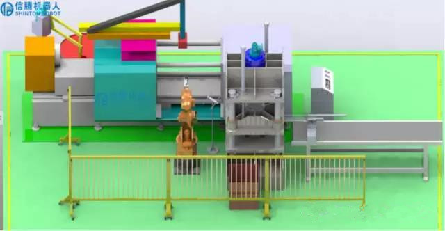 四、伺服噴霧機負責噴霧,機器人取件、檢測、放入切邊機,待切好邊的產品取出放入成品箱,料柄渣包掉入廢料箱。特點:適合于規則對稱產品。如下圖