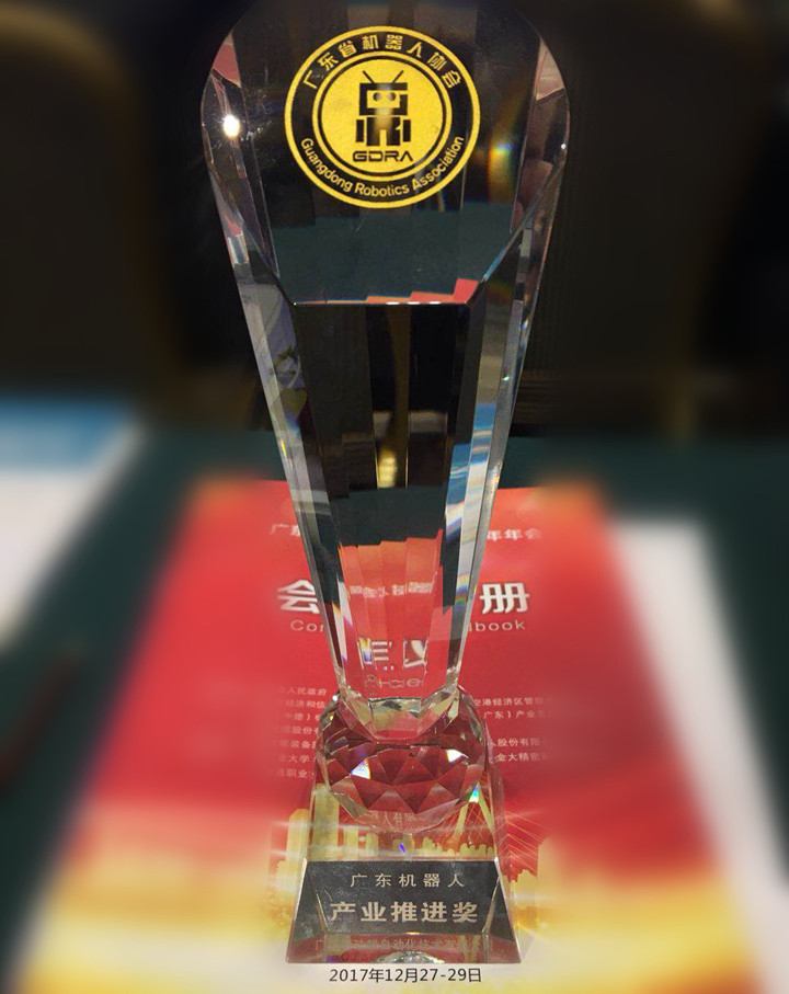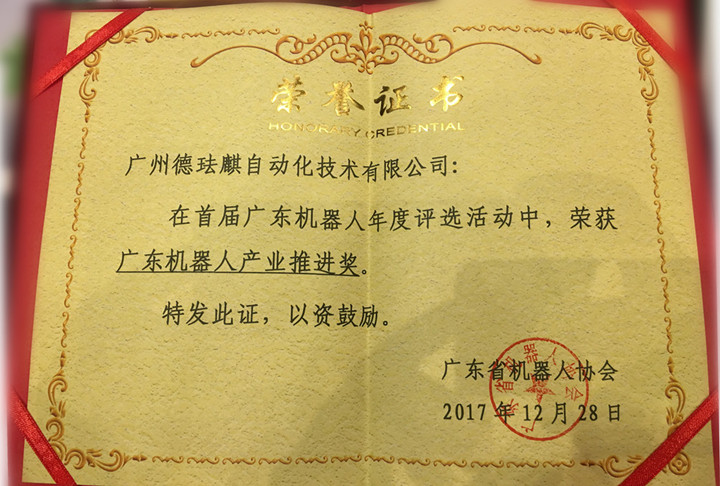 廣州德琺麒獲得“廣東機器人產業推進獎”證書 廣東機器人年度評選是廣東省機器人協會成立以來舉辦的第一屆評選活動,旨在表彰、激勵2017年對廣東省機器人產業作出突出貢獻的企業,發揮先進企業的示范引領作用,推動形成創新、創業的社會氛圍,助力機器人技術革新和產業發展。