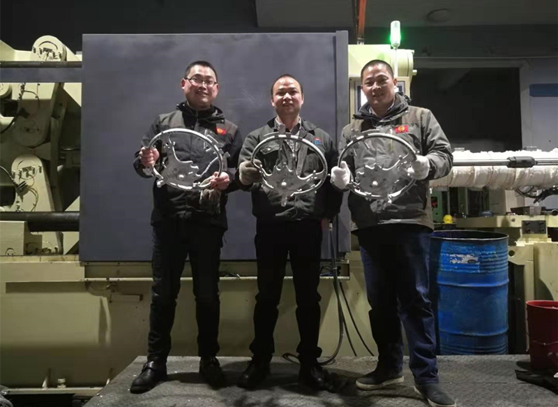 半固態(tài)注射成型機生產(chǎn)的鎂合金方向盤骨架,右1為朱義兵先生 值得一提的是,鎂合金半固態(tài)注射成型機生產(chǎn)時,無需六氟化硫SF6保護氣體(SF6是溫室效應氣體,它對溫室效應的影響相當于CO2的約25000倍,許多工業(yè)發(fā)達國家已立法禁止使用)。加之,其熔料過程在密閉環(huán)境中進行,沒有煙氣排放。所以,它在環(huán)境保護方面表現(xiàn)卓越。