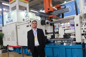中山德工展示了一款型號為DC550的高性能冷室壓鑄機,并配備了給湯、噴霧、取件機械手,壓鑄機與機器人形成聯動,噴霧、合模、給湯、壓射、開模、取件每一個動作緊湊而精準,吸引了絡繹不絕的專業觀眾。