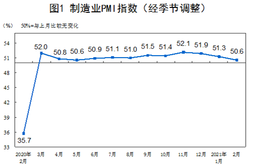 2021年2月,中國制造業(yè)采購經(jīng)理指數(shù)(PMI)為50.6%,低于上月0.7個百分點(diǎn),連續(xù)12個月位于臨界點(diǎn)以上,制造業(yè)景氣水平較上月有所回落。