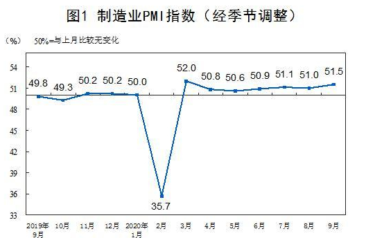 9月份,中國制造業(yè)采購經(jīng)理指數(shù)(PMI)為51.5%,比上月上升0.5個百分點(diǎn),表明制造業(yè)景氣有所回升。
