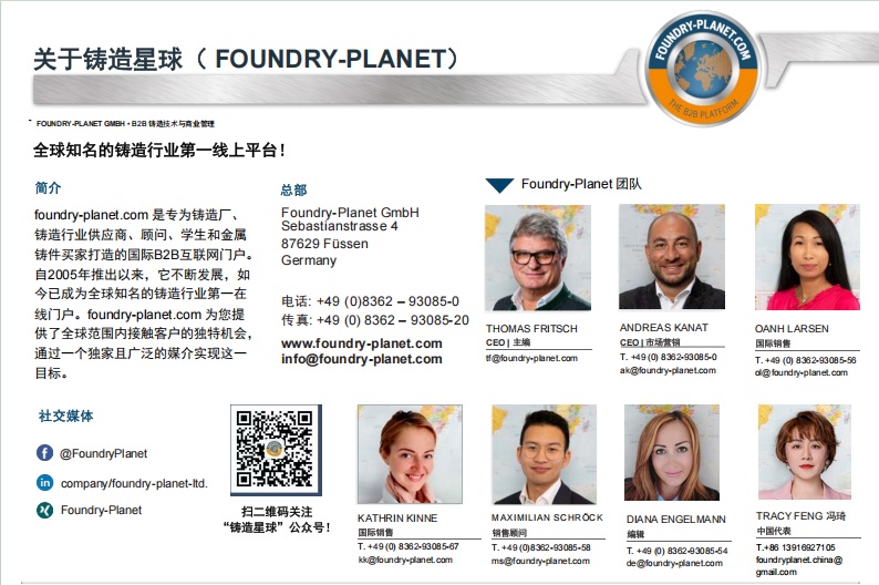 foundry-planet.com 是專為鑄造廠、鑄造行業供應商、顧問、學生和金屬鑄件買家打造的國際B2B互聯網門戶。