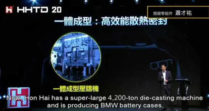 在鴻海科技日上,鴻海的首席產品官(CPO)Jerry Hsiao蕭才祐介紹,富士康成功地將7個前懸架車身板和27個后縱軌部件分別減少為單一鑄造件。