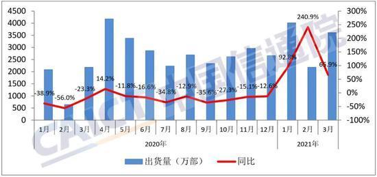 3月,國內手機市場總體出貨量3609.4萬部,同比增長65.9%。
