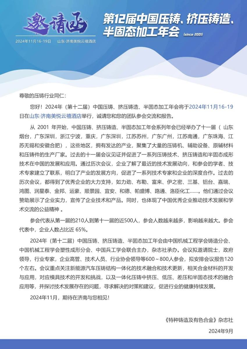 2024中國壓鑄、擠壓鑄造、半固態加工年會邀請函