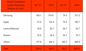 2014年全球智能手機(jī)出貨量增3成至13億部