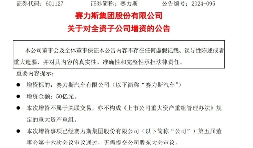 賽力斯將以自有資金向賽力斯汽車增資50億元,使其注冊資本由49.6億元增至99.6億元。