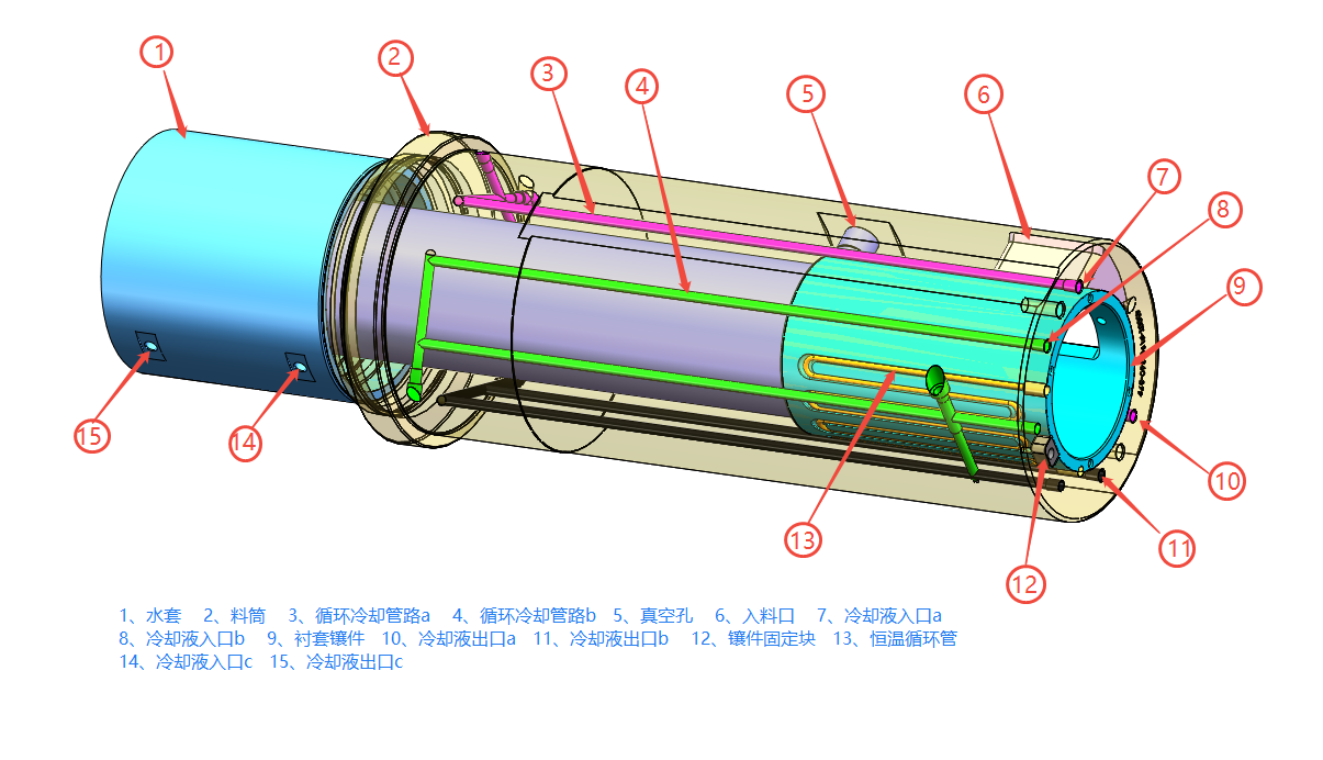 創新技術:一種具有智能控溫的壓射室防腐蝕的料筒 申報企業:寧波皓麗金屬有限公司 創新背景 隨著一體化壓鑄技術的發展,鋁合金壓鑄模具呈現出集成化、大型化趨勢。為應對大型定量爐對壓射室的沖擊,壓射室配件在材料強度、抗疲勞性能等方面提出了更高要求,這種技術革新推動了新型壓射室配件技術的應運而生。
