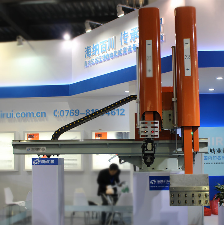 噴霧取件兩用線性機(jī)器人 東莞海瑞的噴霧取件兩用的線性機(jī)器人(HRX-900),運(yùn)用了氣動(dòng)旋轉(zhuǎn)與穩(wěn)定的大尺寸伺服軸設(shè)計(jì),高精度垂直軸與伸縮串聯(lián)結(jié)構(gòu),全伺服馬達(dá)驅(qū)動(dòng),特殊的軟件程序控制,可實(shí)現(xiàn)壓鑄機(jī)與線性機(jī)器人同步移動(dòng),縮短生產(chǎn)循環(huán)周期。 另外,東莞海瑞還展示了多連桿高速取件機(jī)(HRQ-02),該機(jī)型采用進(jìn)口減速電機(jī)驅(qū)動(dòng)手臂,PLC與變頻控制,手臂可在其行程范圍內(nèi)任意點(diǎn)待機(jī),在開(kāi)模前手臂提前行進(jìn)模具邊緣,有效縮短取出時(shí)間,提高生產(chǎn)效率。可單動(dòng),也可與給湯機(jī)、噴霧機(jī)連線成全自動(dòng)化設(shè)備。 深圳鼎正鑫,研制安全易用的鎂熔爐 在本屆展會(huì)上,深圳市鼎正鑫科技有限公司(“深圳鼎正鑫”)展示一套設(shè)計(jì)新穎、安全可靠的鎂合金熔化保溫爐DV系列 DV500型,采用了多項(xiàng)自主專利技術(shù),可大幅度提升鎂合金熔體的安全性、簡(jiǎn)便性。