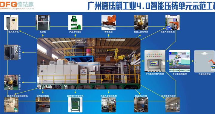 工業(yè)4.0智能壓鑄單元示范工程 據了解,廣州德琺麒此次推介的是一套由UBE宇部2500T壓鑄機為主機的壓鑄島,配置鋁水精準供應爐、恒溫淬火水箱、機器人仿型噴涂、機器人快速取件機、機器人取件視覺系統、超靜音料餅鋸切機、產品沖切整形機、通用去渣包機、機器人智能去毛刺,脫模劑自動配比回收機、模具油溫控制、模具點冷機、真空機,使用中央集成控制與反饋系統“串聯”成一個有機整體,并通過辦公室遠程監(jiān)控、云端遠程控制,組成一套自動化、智能化、數字化的壓鑄生產線。 “我們提供的壓鑄單元,可以實現從合金熔煉、給湯、噴涂、取件,冷卻,檢測,去渣包、切邊、去毛刺,拋光、打磨等工藝的全過程自動化生產和控制,從原材料到合格的成品流水線作業(yè)一步到位,”蒲昌月先生表示:“構建一套壓鑄島是一項系統工程,可以考驗一家企業(yè)的整合能力、集成能力,我們專注于壓鑄行業(yè)二十多年,形成一套科學實用的設計理念,掌握在集成、控制、應用、工藝方面的核心技術,開發(fā)和提供優(yōu)質、高效、穩(wěn)定、低耗的壓鑄島。”