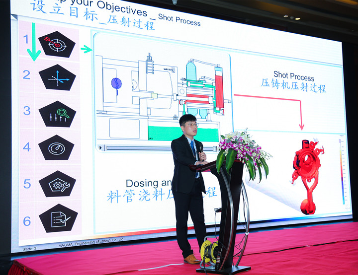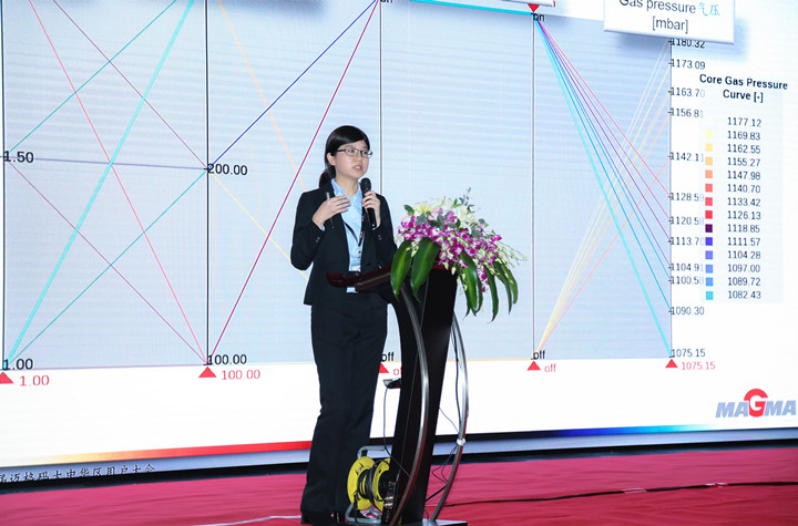 趙望前博士 緊接著正式進(jìn)入用戶(hù)大會(huì)的主要議題,介紹和分享MAGMASOFT的應(yīng)用成果及新功能。邁格碼中國(guó)的高杰先生分享了“MAGMASOFT 6步法(MAGMA APPROACH)在黑色金屬領(lǐng)域的應(yīng)用”報(bào)告;邁格碼中國(guó)的孫娜女士分別以“使用MAGMASOFT 6步法(MAGMA APPROACH)優(yōu)化低壓鑄造工藝”、“應(yīng)用MAGMASOFT 5.4的噴涂功能精確控制模具溫度”先后做兩次報(bào)告;邁格碼中國(guó)的劉琪明先生介紹了“MAGMASOFT 5.4版本如何確定最精確的高壓低速壓射速度”;邁格碼中國(guó)的王文權(quán)先生分享了“MAGMASOFT 5.4精確的冷卻控制及頂出變形”報(bào)告;邁格碼中國(guó)的嚴(yán)丹寧女士,介紹了“應(yīng)用MAGMASOFT 5.4全面快速分析砂芯發(fā)氣及熱平衡”。